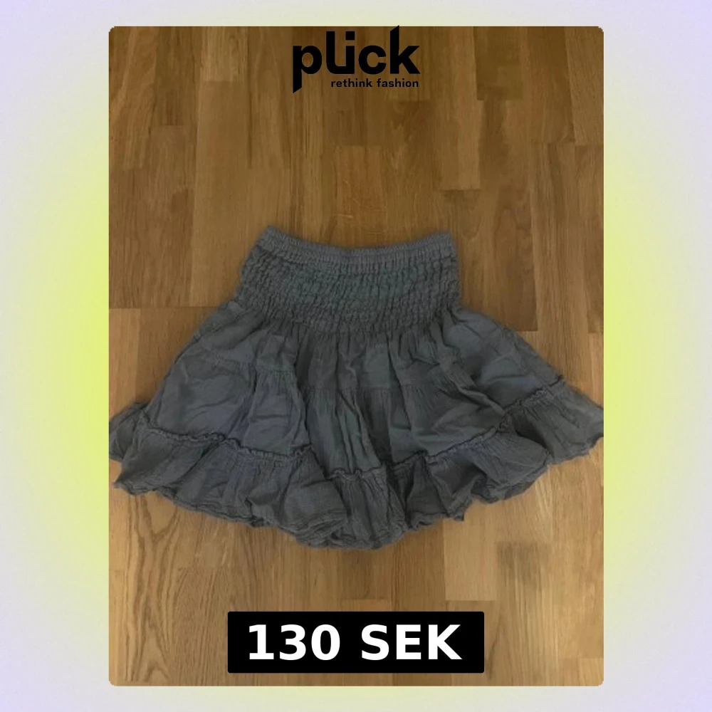 Supersöt grå kortkjol med bred smock i midjan och flera lager volanger. Köptes i en butik i Thailand och är helt oanvänd. Materialet känns mjukt och lätt mot huden.