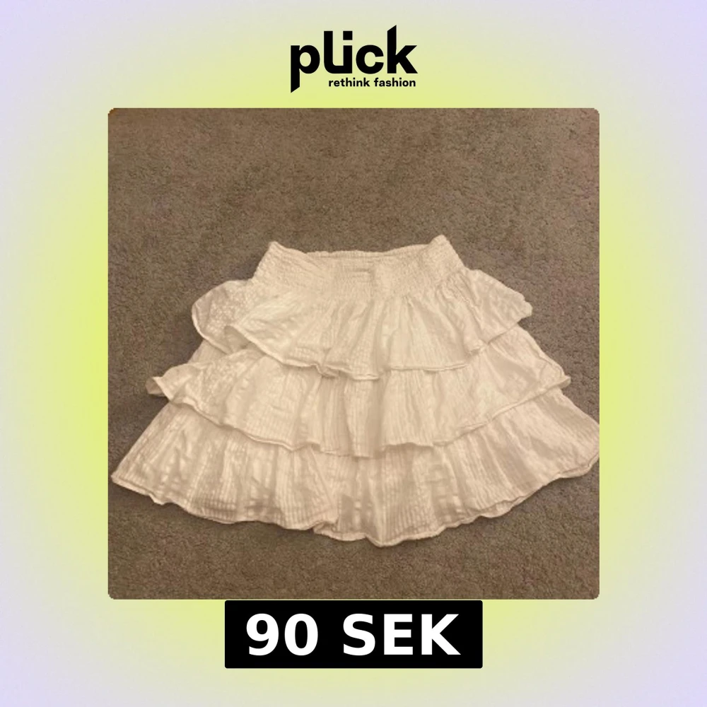 Supersöt vit kortkjol med flera lager volanger och bred smockad resår i midjan. Kjolen har en lätt skrynklig struktur och ger en riktigt flowy känsla. storlekn är 146-152 men eftersom att den är stretchig så skulle jag säga XS. Skriv privat för bilder på💕lite skrynklig men stryker innan leverans!