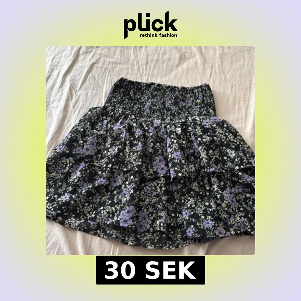 Supersöt kort kjol med svart botten och lila blommor. Kjolen har smock i midjan och dubbla volanger. Perfekt för dig som gillar blommigt och vill ha något bekvämt och snyggt till sommaren. Skulle säga att den är stor i storlek och går ca till halva låret.
