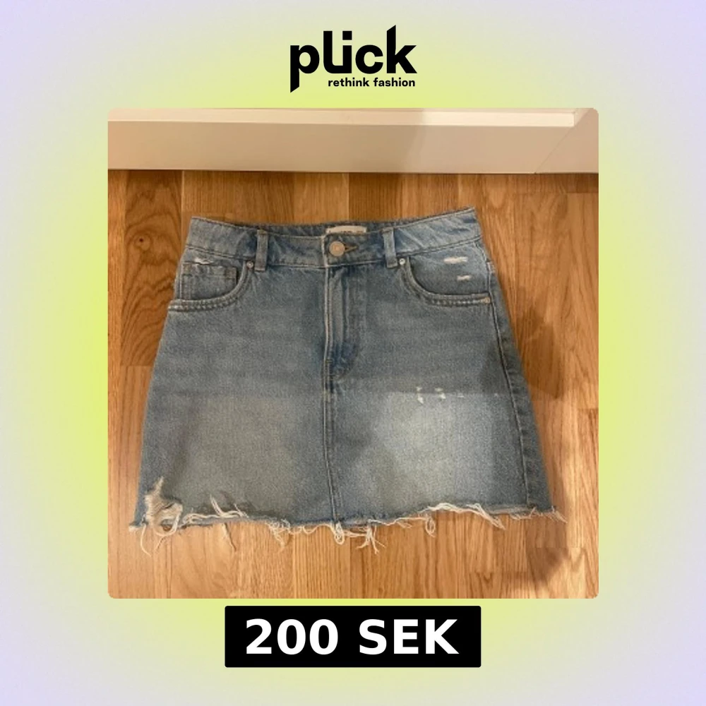Blå jeanskjol - Snygg kort jeanskjol i blå tvättad denim. Kjolen har klassiska fem fickor. Snygga slitningar och kontrastsömmar ger en cool vibe. Med fina detaljer på fickorna. Köpte för 489