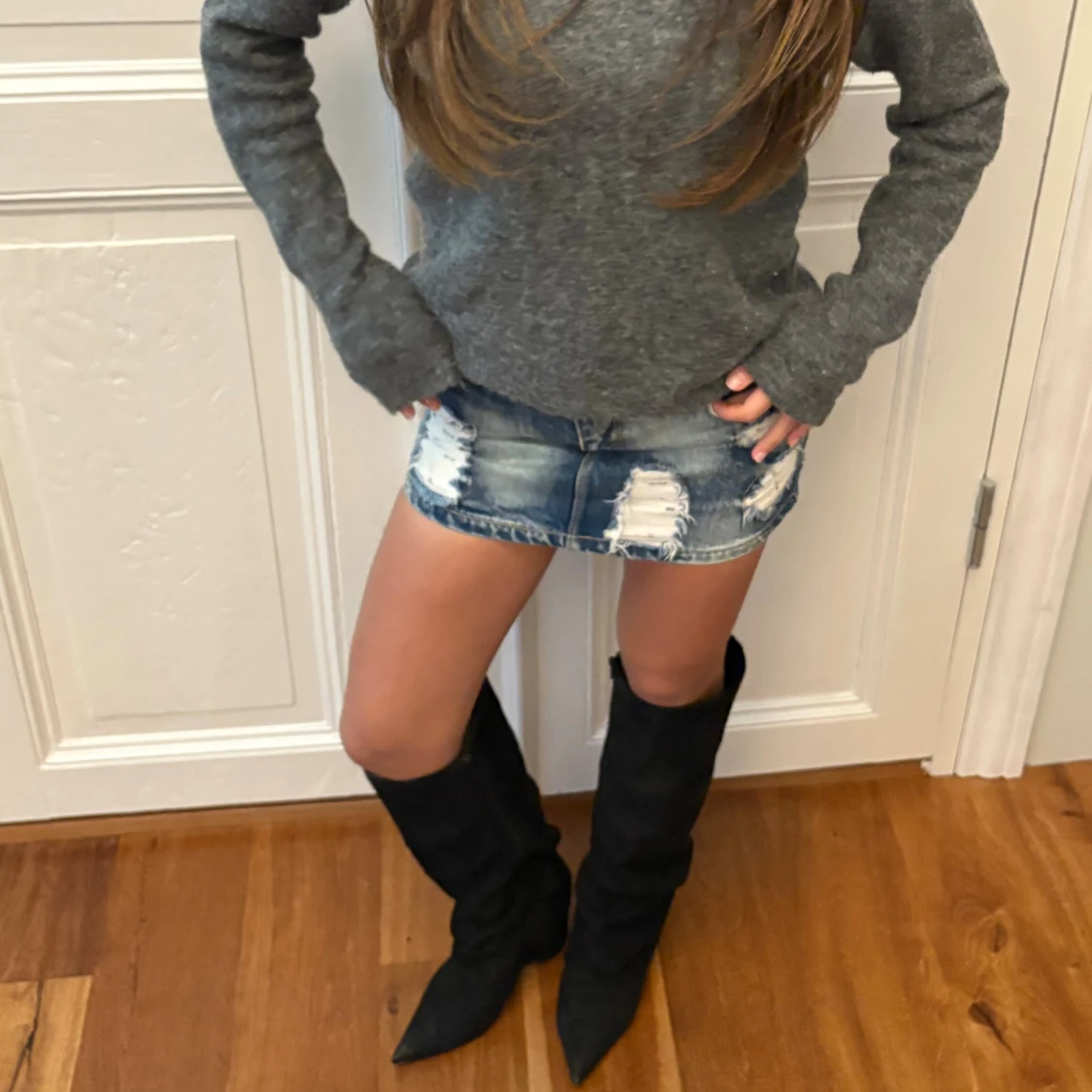 Säljer en kort jeanskjol i blå denim med tydliga slitningar och fransiga detaljer både fram och bak. Kjolen har klassiska fickor, bälteshällor och en knapp framtill. Perfekt för dig som gillar en edgy och avslappnad stil.
