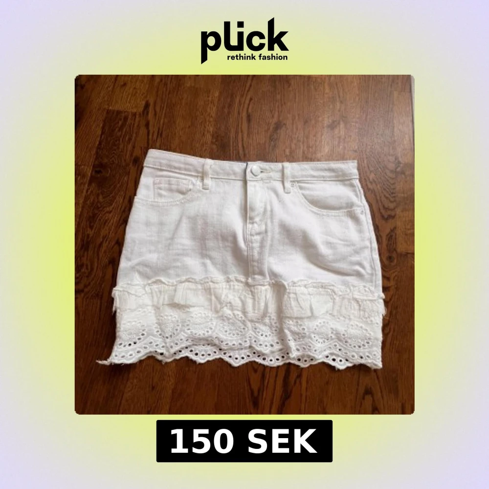 Säljer en vit jeanskjol med volang och broderad spets längst ner. Kjolen har klassiska jeansfickor fram och bak samt knapp och dragkedja i midjan. Perfekt för dig som gillar romantiska detaljer och vill ha en söt look.💗