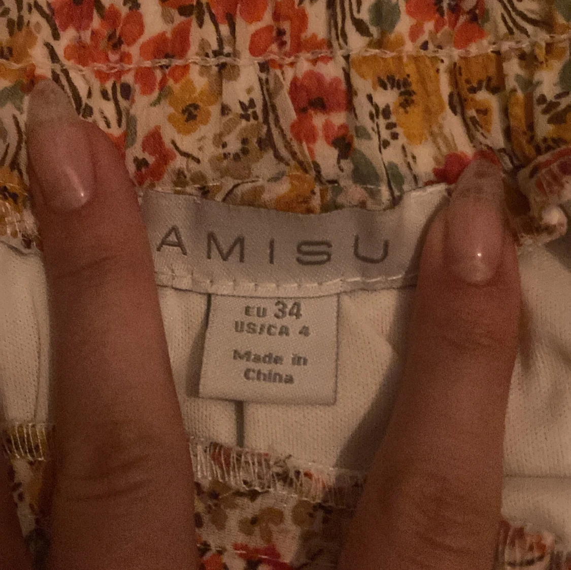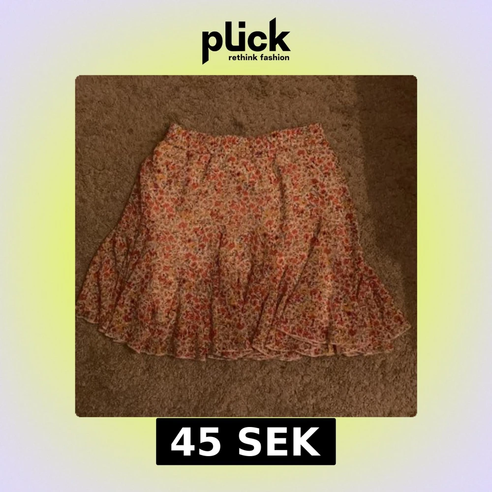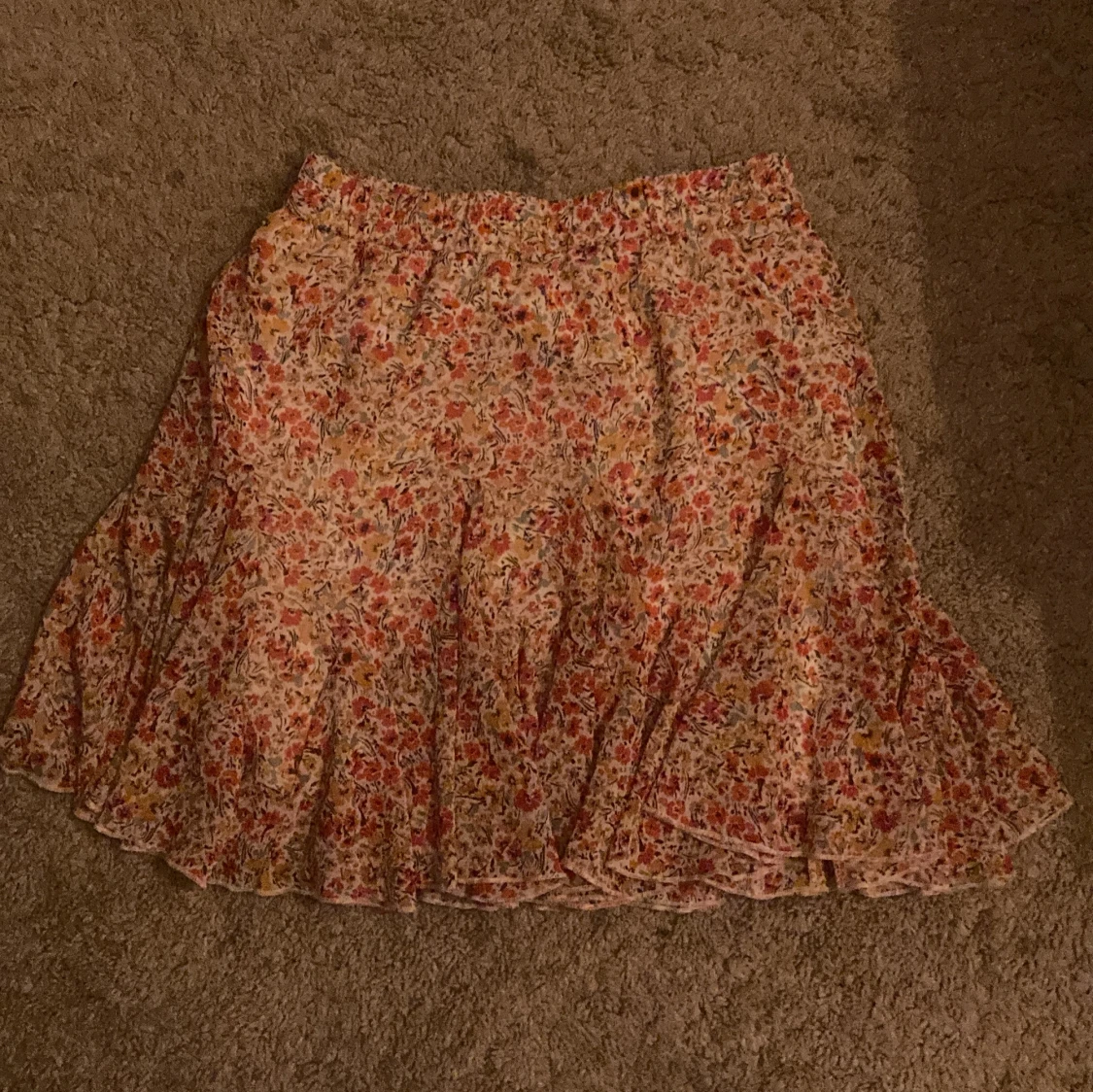 Supersöt kortkjol från Amisu i storlek 34 med blommigt mönster i rött, gult och grönt på vit botten. Kjolen har volangkant och är gjord i ett lätt och luftigt material, perfekt för varma dagar. Elastisk midja för skön passform.