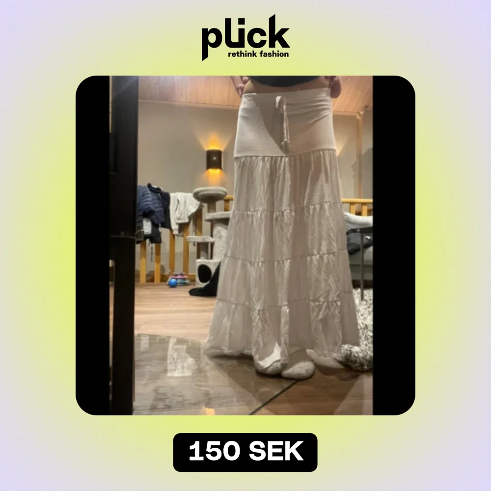Lång, vit kjol från Boohoo i storlek 34💕Den är lite smått genomskinlig och lappen sitter fortfarande kvar. Jag är 160 cm lång och kjolen räcker precis ner till mina fötter💗