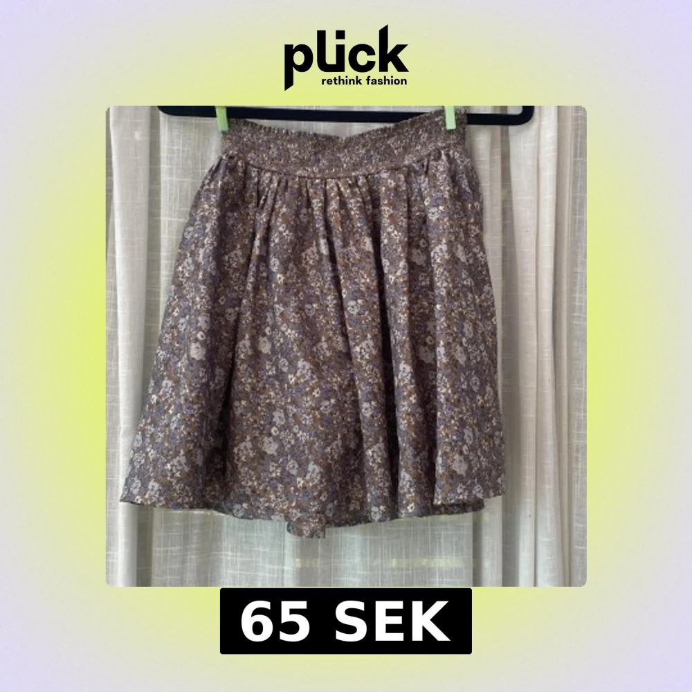 Säljer en söt kortkjol med småblommigt mönster i lila, beige och bruna toner. Kjolen har en bred resår i midjan och är fodrad . Perfekt för våren.