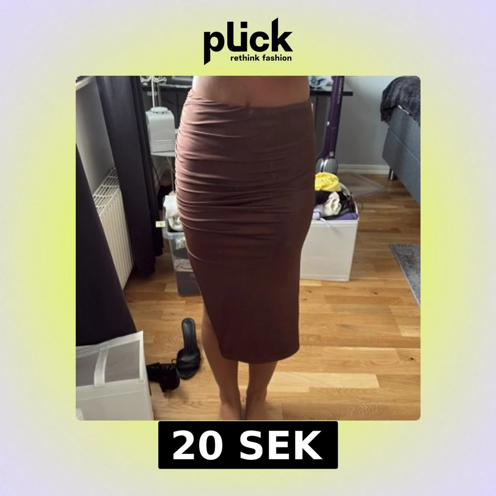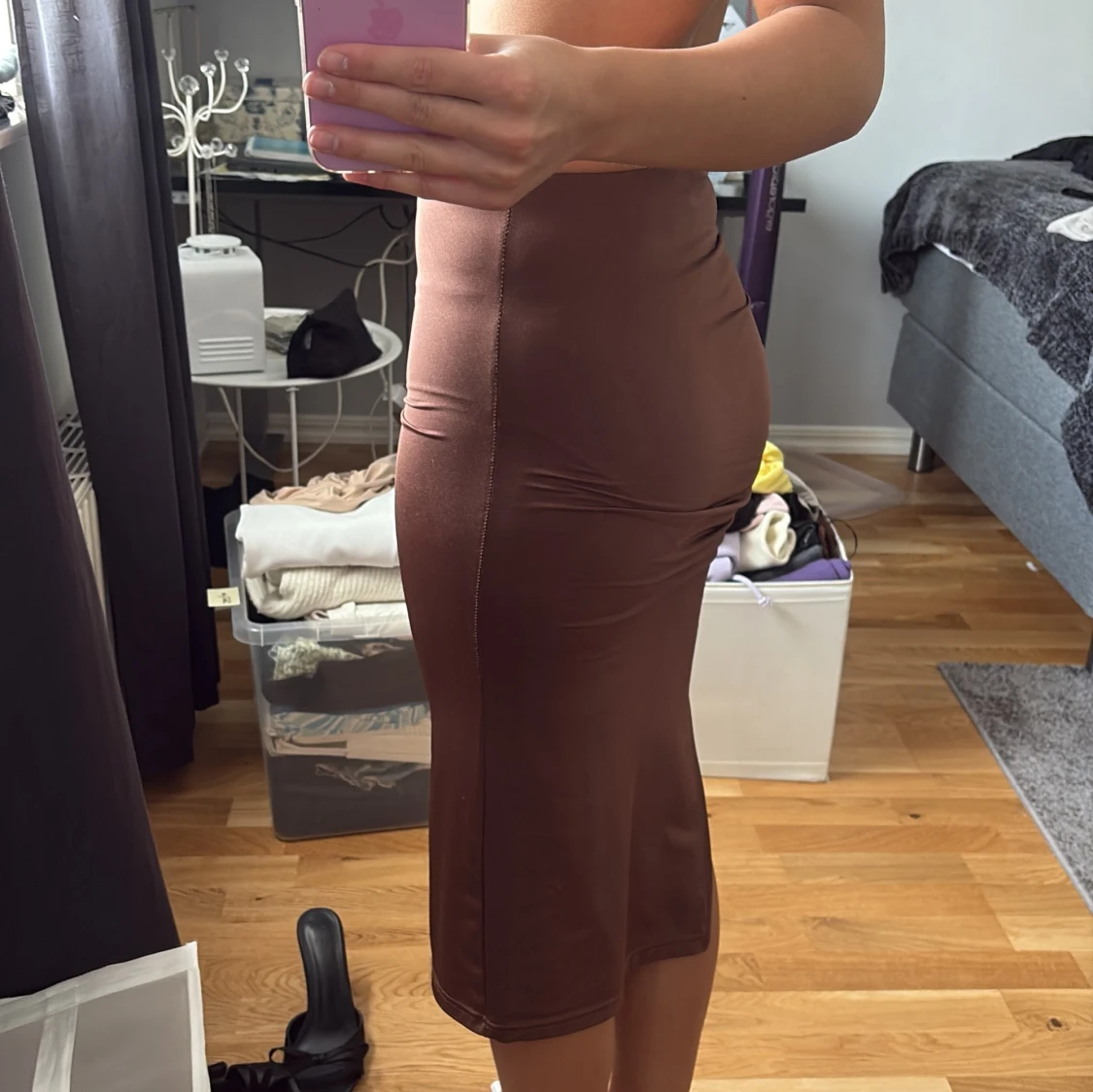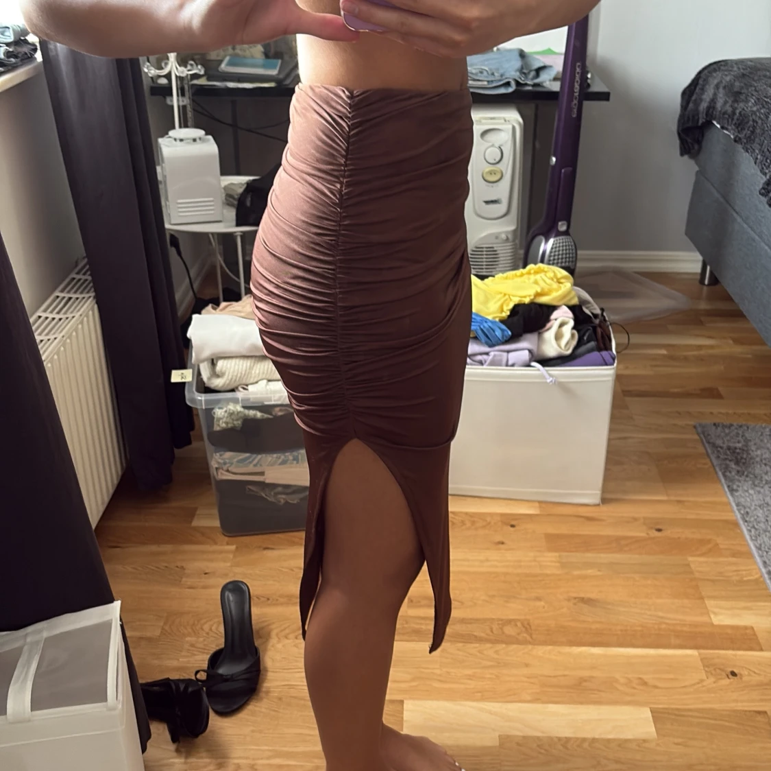 Säljer en brun långkjol i tight passform med snygg rynkning på ena sidan och en hög slits. Kjolen är figurnära och har en mjuk, stretchig känsla som sitter skönt på kroppen. Perfekt för dig som gillar en stilren look med lite edge.