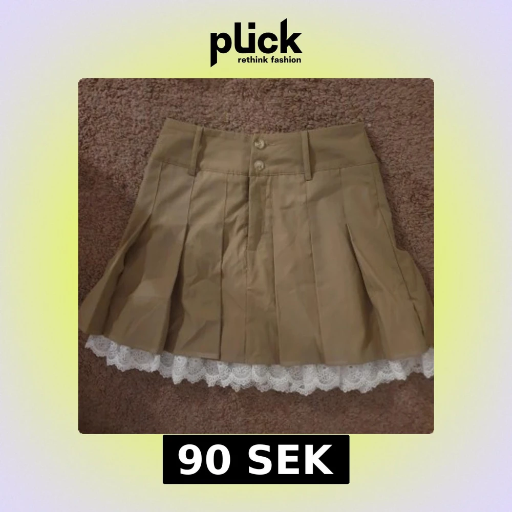 Snygg beige kortkjol med veckad design och vit spetskant som sticker fram nedtill. Kjolen har knappar framtill och en stilren look som passar perfekt för olika tillfällen.