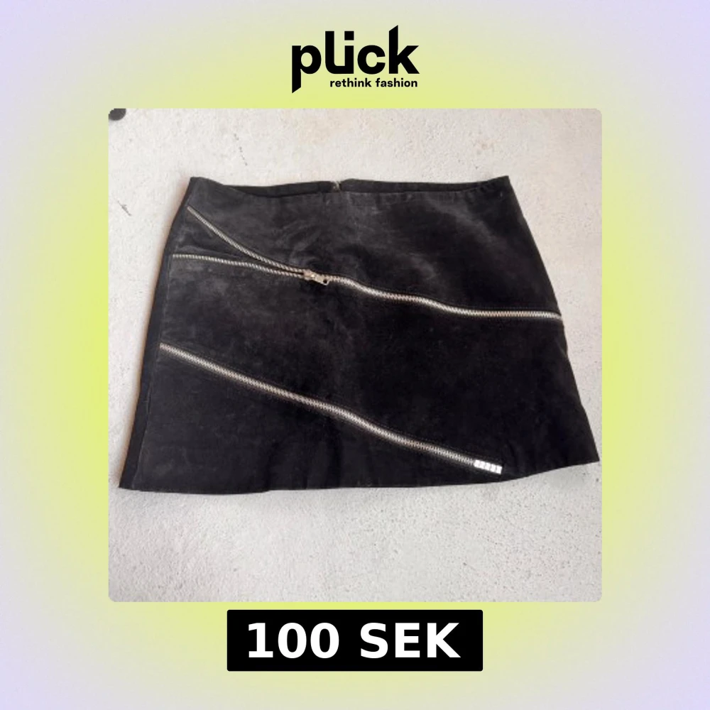 Cool svart kortkjol i mocka från Att. med två sneda silverfärgade dragkedjor framtill. Strl 34. Dragkedja bak. Midjemått ~78cm Längd ~33cm Bit av sömnen på sidan har gått upp men syns inte.