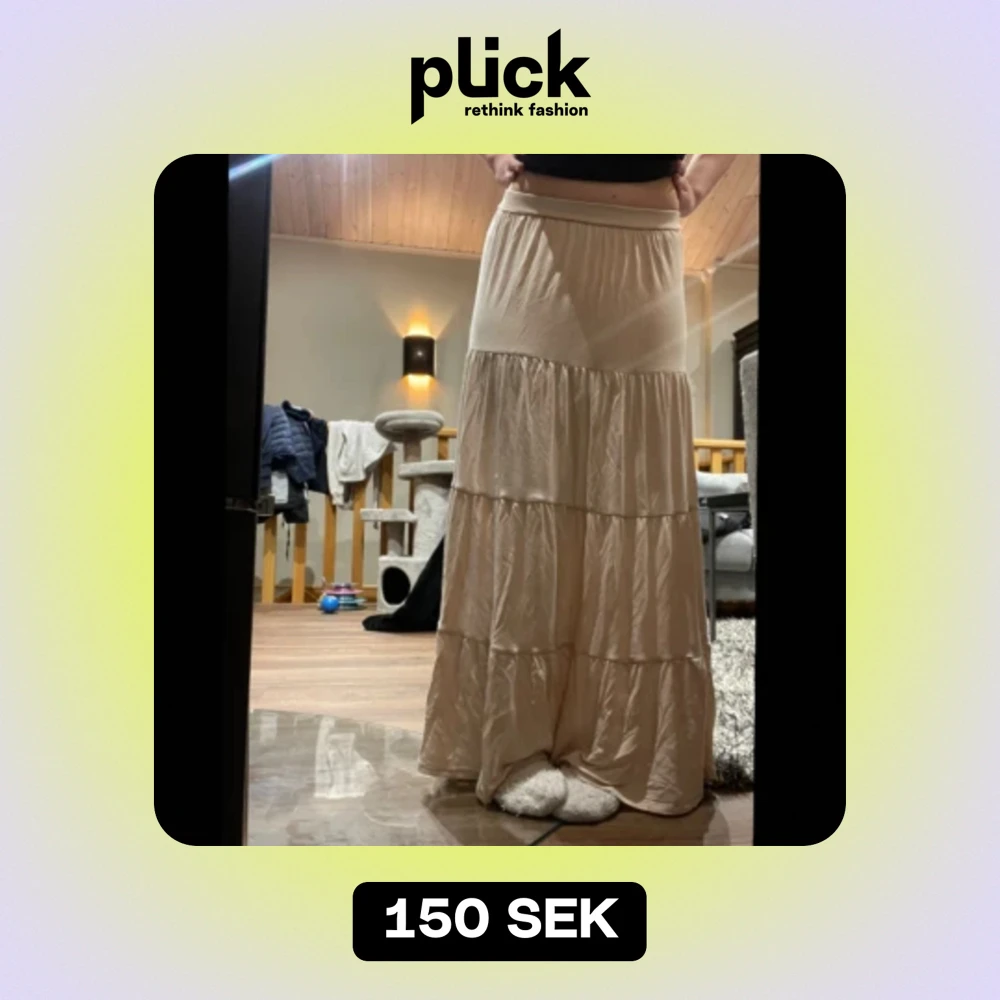 Beige långkjol från Boohoo i storlek 34🎀 Lite smått genomskinlig och räcker precis ner till mina fötter (jag är 160 cm lång)💗