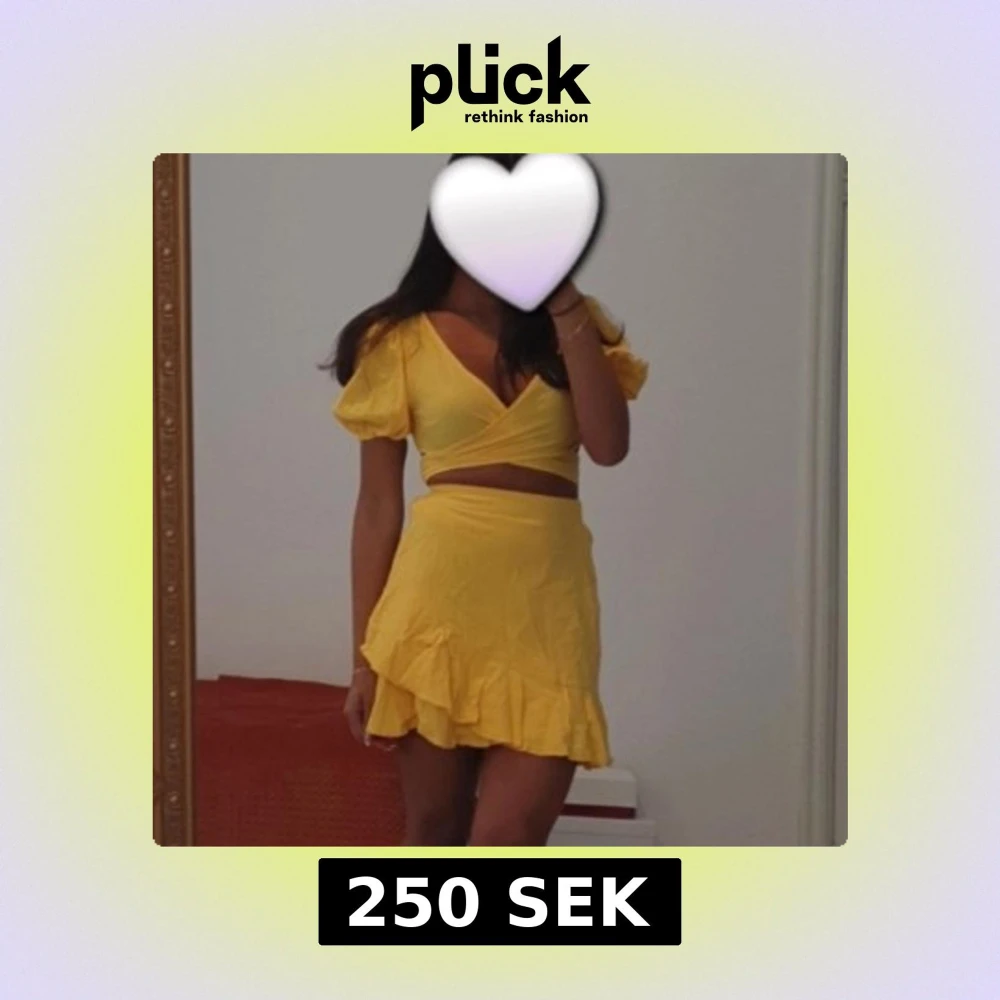 Säljer en kort gul kjol & topp med volangkant och omlott-design. Kjolen har en mjuk och lätt känsla, perfekt för varma dagar. Den har en feminin och trendig look med volanger som ger extra rörelse. Passar dig som gillar färgglada och somriga outfits.
