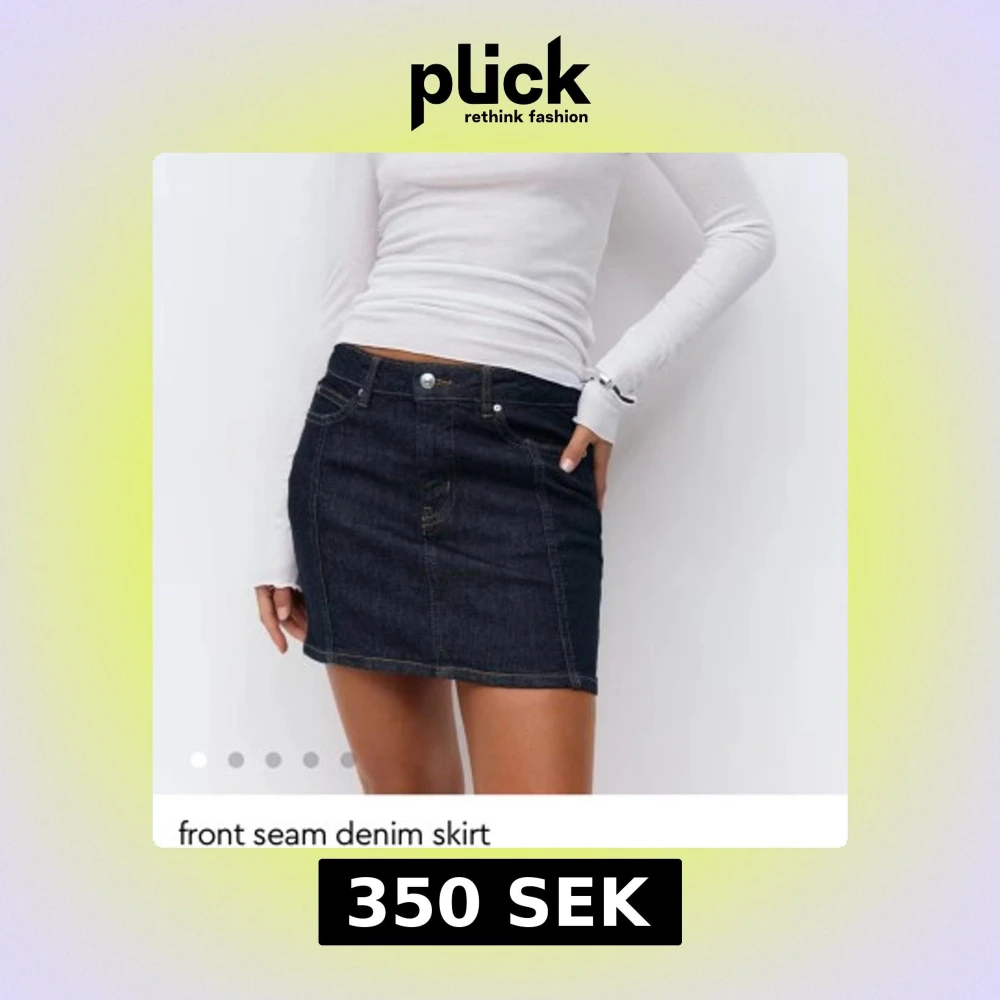 Snygg mörkblå jeanskjol med markerad söm framtill och klassiska fickor både fram och bak. Kjolen har en kort passform och stängs med knapp och dragkedja. Perfekt att styla med en enkel topp eller hoodie. Den här lapparna kvar och är slutslåld