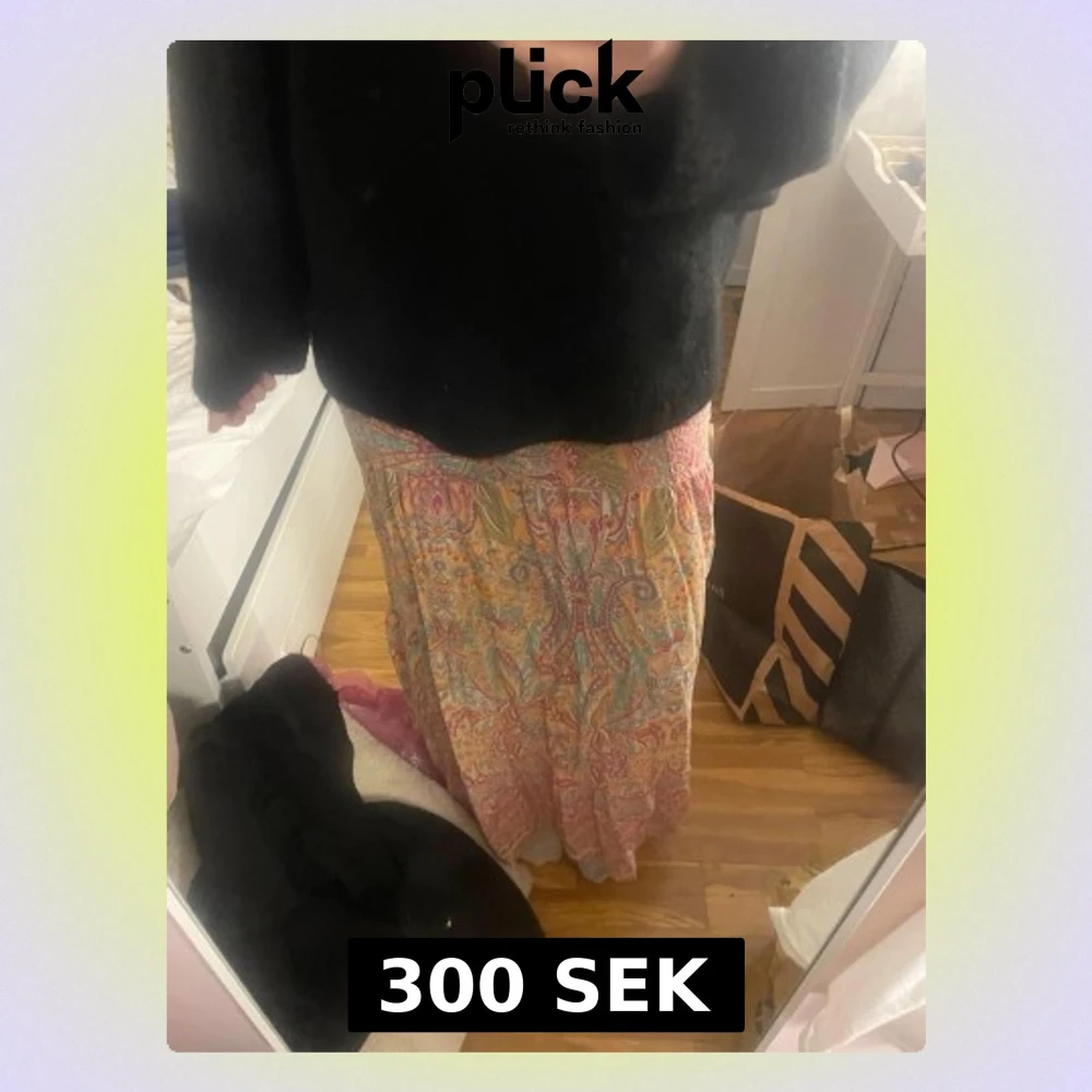 Säljer en långkjol med färgstarkt paisleymönster i orange, rosa, blått och grönt. Kjolen har en flowy passform och är gjord i ett tunt, mjukt tyg som känns luftigt.