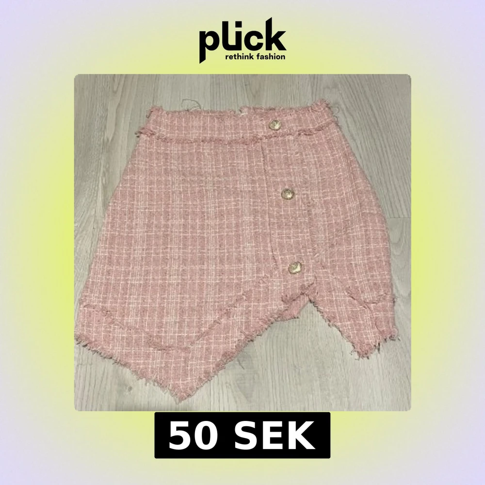 Säljer en rosa kortkjol med rutigt mönster och råa kanter. Kjolen har en unik asymmetrisk nederkant och tre dekorativa guldfärgade knappar framtill. Materialet känns som en blandning av bomull och polyester, perfekt för vår och sommar.