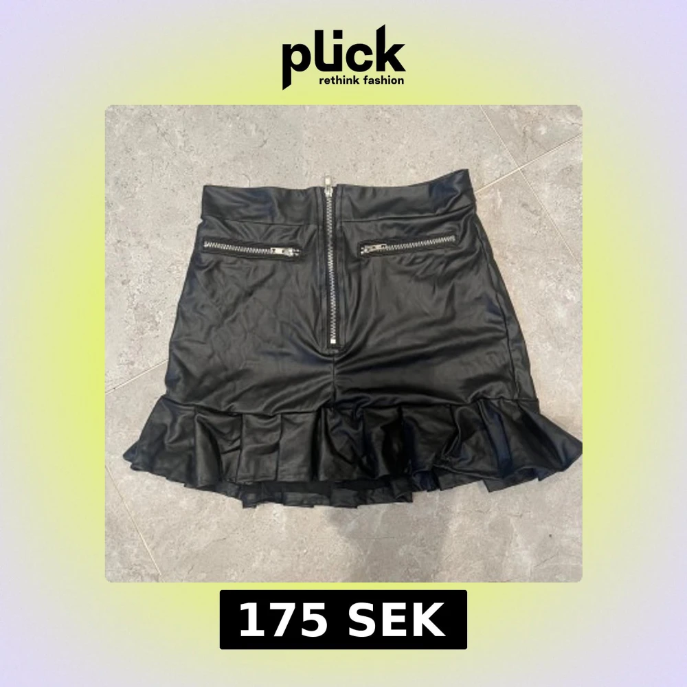 Snygg svart kort kjol i skinnimitation med volangkant nertill. Kjolen har två dragkedjor framtill och en stor dragkedja mitt bak för en edgy look. Perfekt för dig som vill sticka ut med en cool och trendig stil.