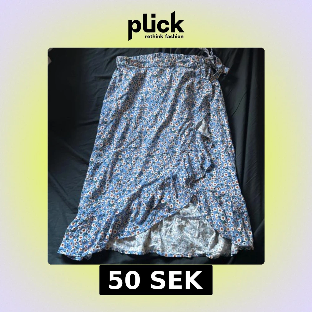 Supersöt blå omlottkjol från JDY med blommigt mönster i vitt, gult och rött. Kjolen har volangdetaljer längs kanten och knyts i midjan. Perfekt för dig som gillar en feminin och somrig stil.