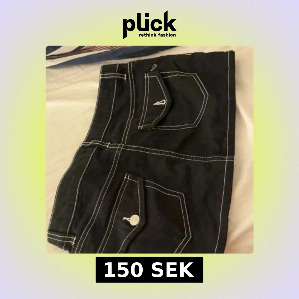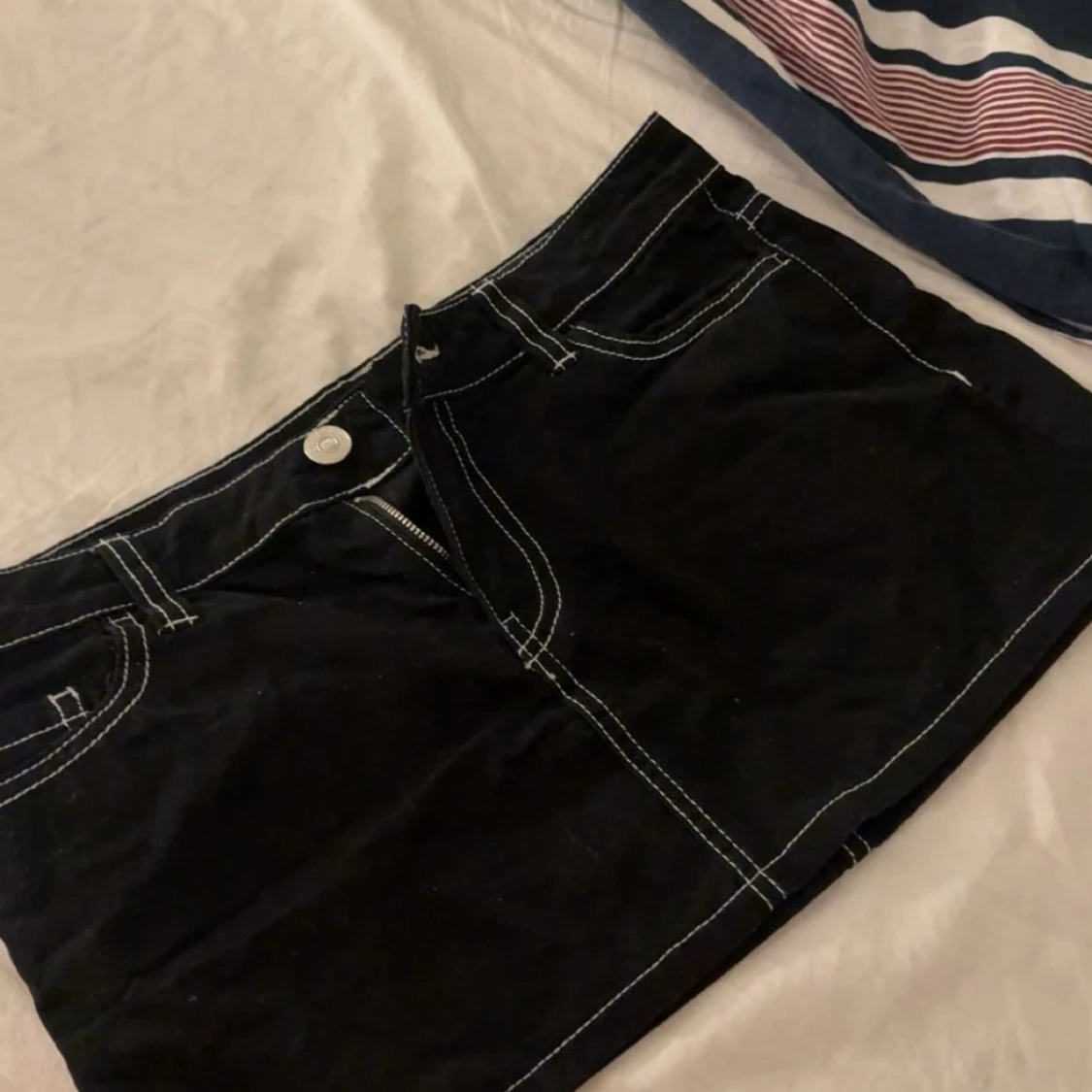 Svart kortkjol med vita kontrastsömmar och stora fickor framtill. Kjolen har knapp och dragkedja i midjan samt bälteshällor. Snygg streetstil med markerade detaljer fickor.