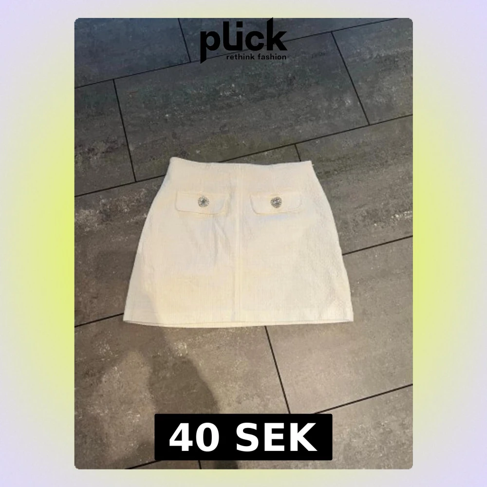 Stilren vit kortkjol med två fickor framtill, dekorerade med glittriga knappar. Kjolen har en rak passform och är tillverkad i ett strukturerat tyg som ger en exklusiv känsla. Perfekt att matcha med en snygg topp eller stickad tröja.