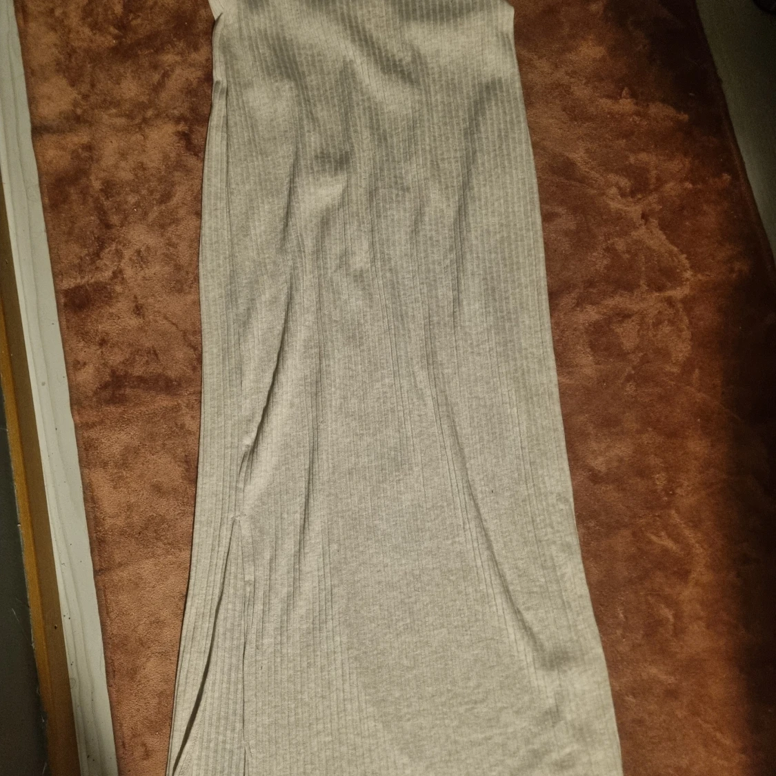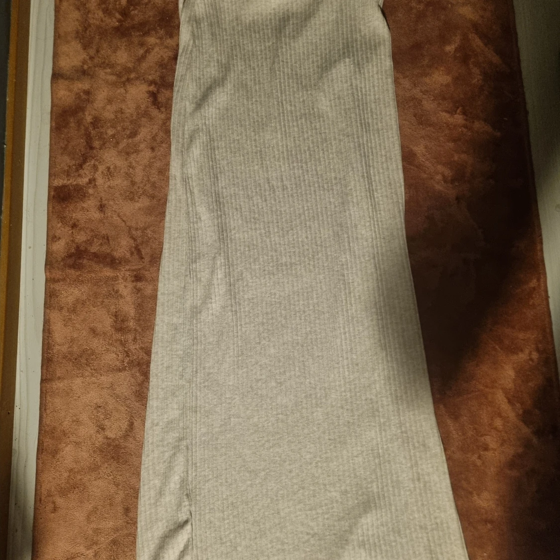 Säljer en beige långkjol med diskreta vertikala ränder och ribbad struktur. Kjolen har en rak passform och en liten slits framtill för extra rörelsefrihet. Perfekt för dig som gillar en stilren och enkel look.