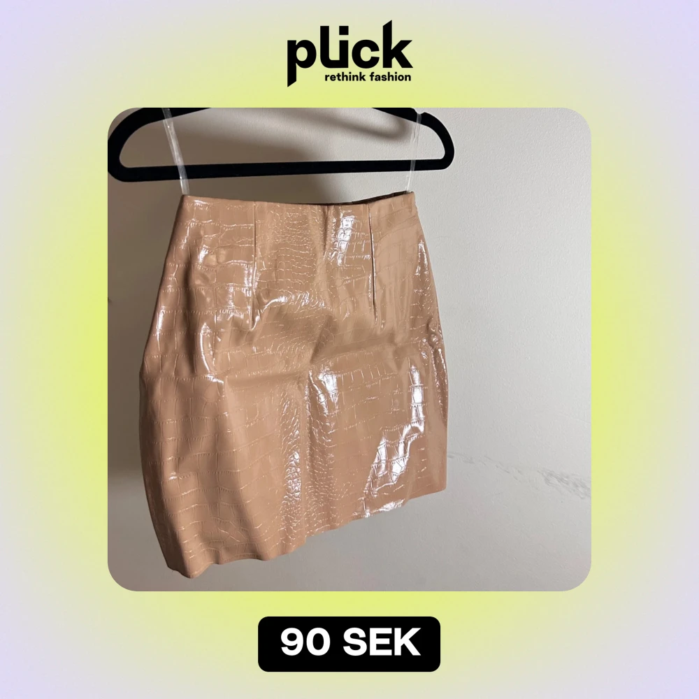 Beige kjol med krokodilpräglat mönster. Perfekt för en utekväll eller fest! Kjolen har en tight passform som formar höfterna fint och en diskret dragkedja på sidan för enkel på- och avtagning. Materialet ger en glansig finish som verkligen sticker ut.