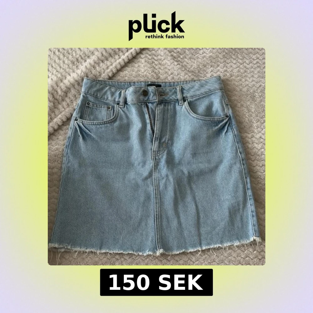 Säljer en ljusblå jeanskjol från NLY Jeans med klassisk femficksdesign, bälteshällor och rå, fransig kant nedtill. Kjolen är kort och har dragkedja och knapp framtill. Perfekt för dig som gillar en avslappnad och trendig stil.