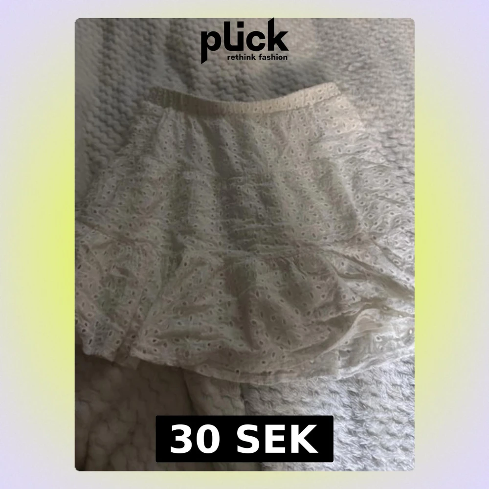 Supersöt vit kort kjol med volangkant och broderade hål. Kjolen har resår i midjan och är gjord i ett lätt bomullstyg som känns luftigt och somrigt. Perfekt för dig som gillar romantiska detaljer och vill ha en feminin look.