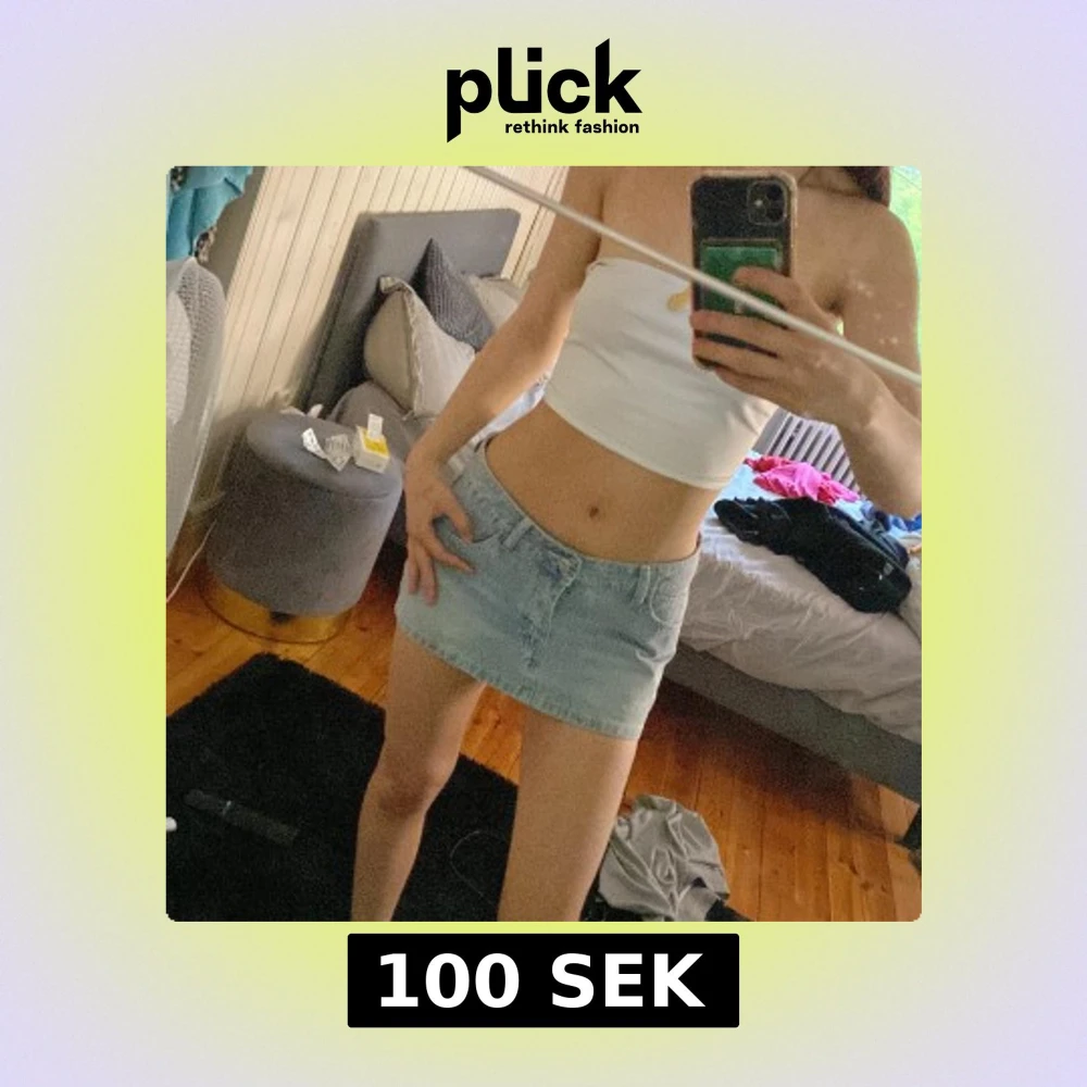 Säljer en ljusblå kort jeanskjol med klassisk femficksdesign och knapp framtill. Perfekt för dig som gillar en enkel och stilren look. Kjolen har en normal passform och är lätt att matcha med olika toppar.