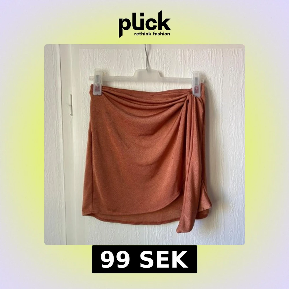 Säljer en kort rostfärgad kjol med omlottdetalj och drapering framtill. Kjolen har en mjuk och följsam känsla.