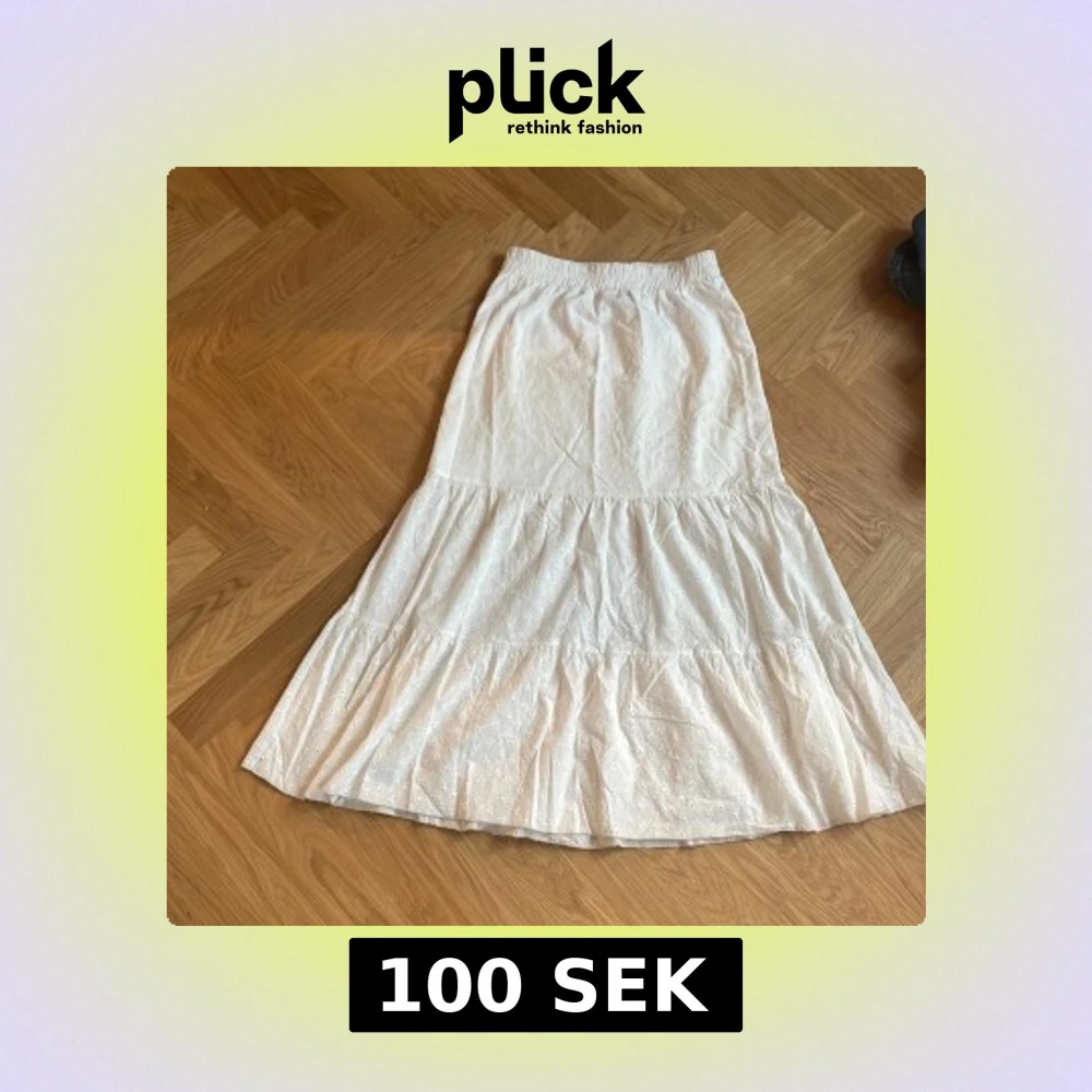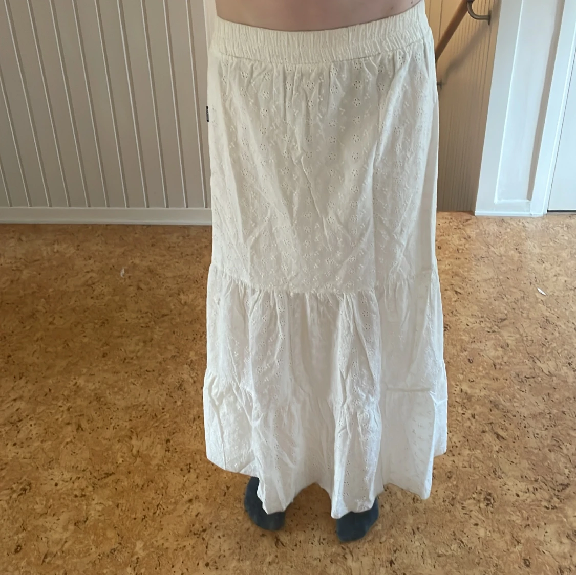 Säljer en vit långkjol med broderade blommor och volang. Kjolen har resår i midjan och är tillverkad i ett lätt bomullstyg. Perfekt för dig som gillar en feminin och luftig stil. Jag skulle säga att dom e ganska små i storlekarna så jag skulle kunna tänka min att det skulle passa i s-xs