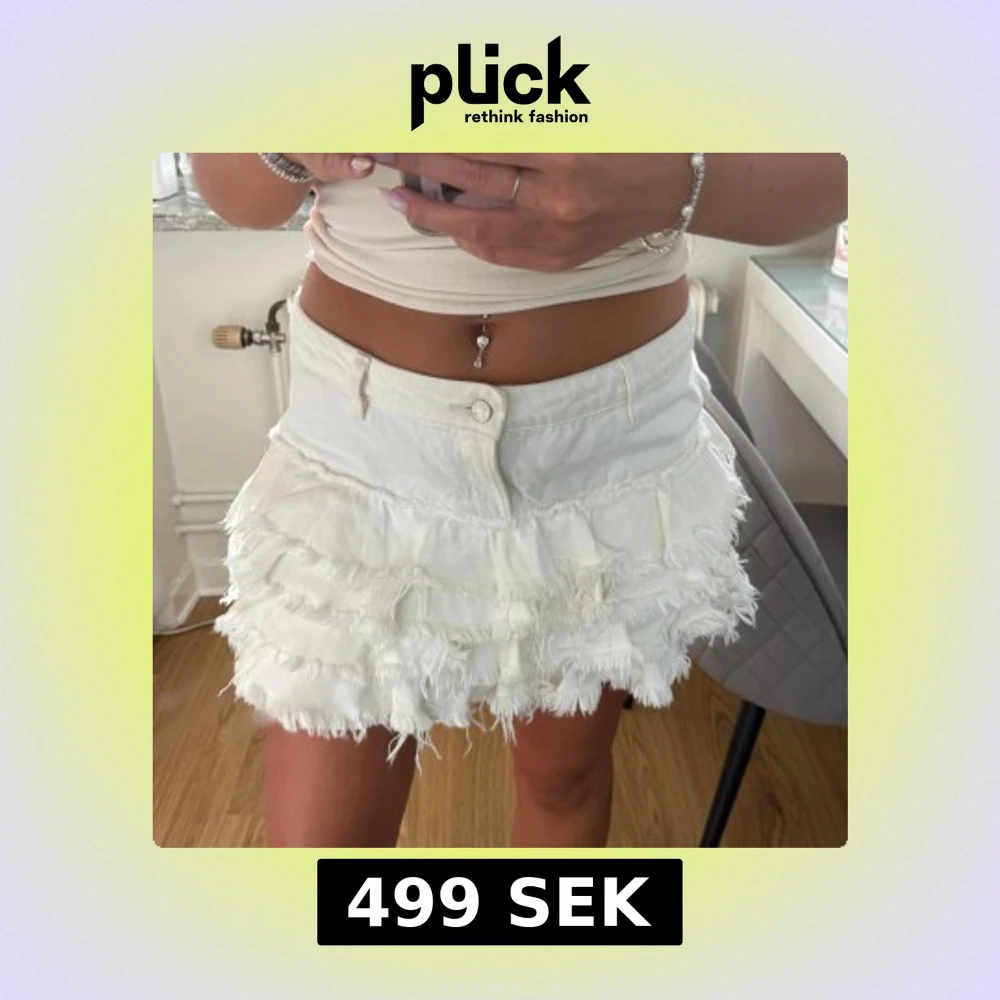 vit jeanskjol med volanger/fransar, helt slutsåld och i fint skick, strl 38, 499kr
