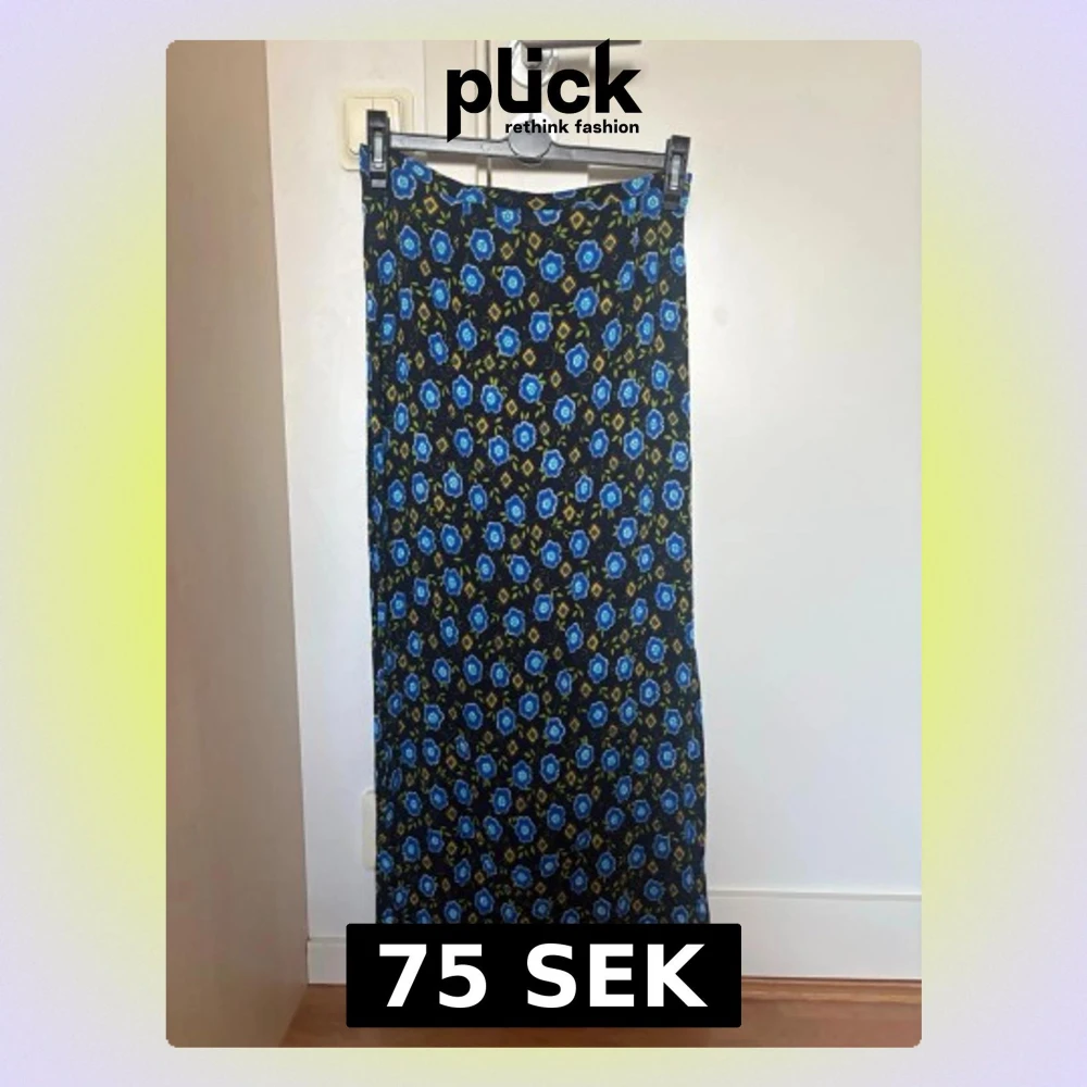 Snygg långkjol med blått blommönster med svart botten och inslag av gult. Kjolen har rak passform och är perfekt för dig som gillar färg och mönster.
