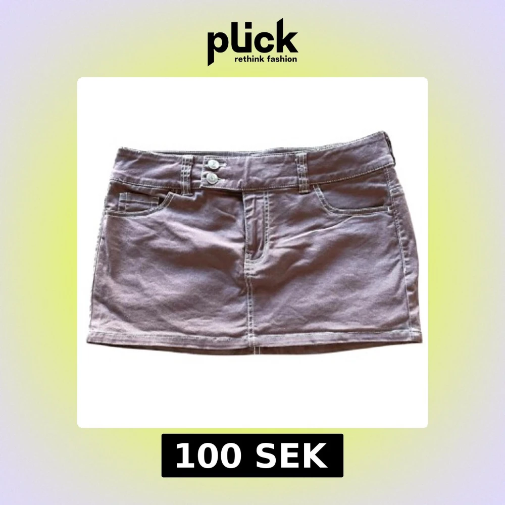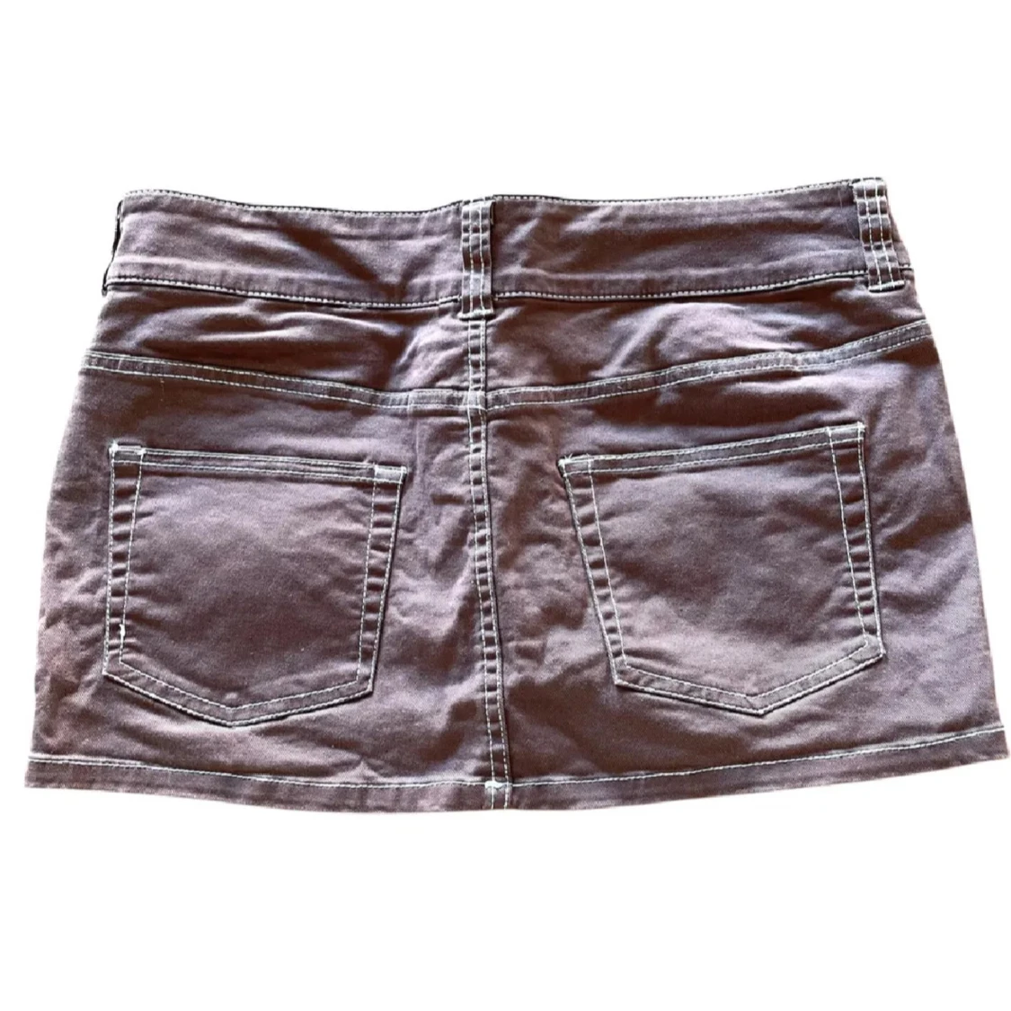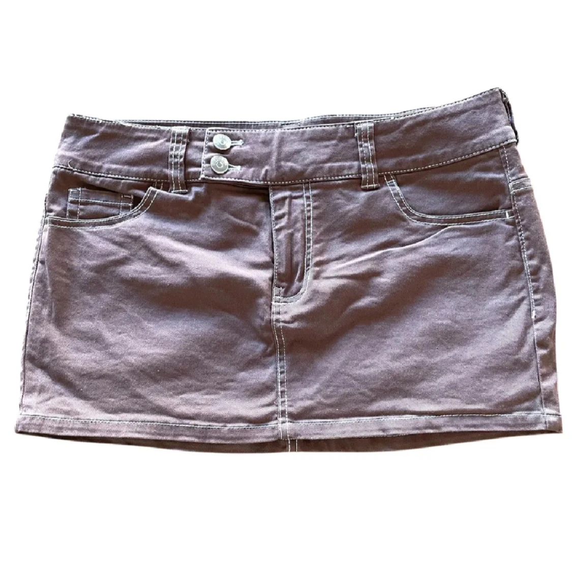 Snygg brun kortkjol med två framfickor, två bakfickor och dubbla knappar i midjan. Kjolen har synliga vita sömmar och bälteshällor, vilket ger en cool och avslappnad vibe. Perfekt för dig som gillar enkel och stilren design.