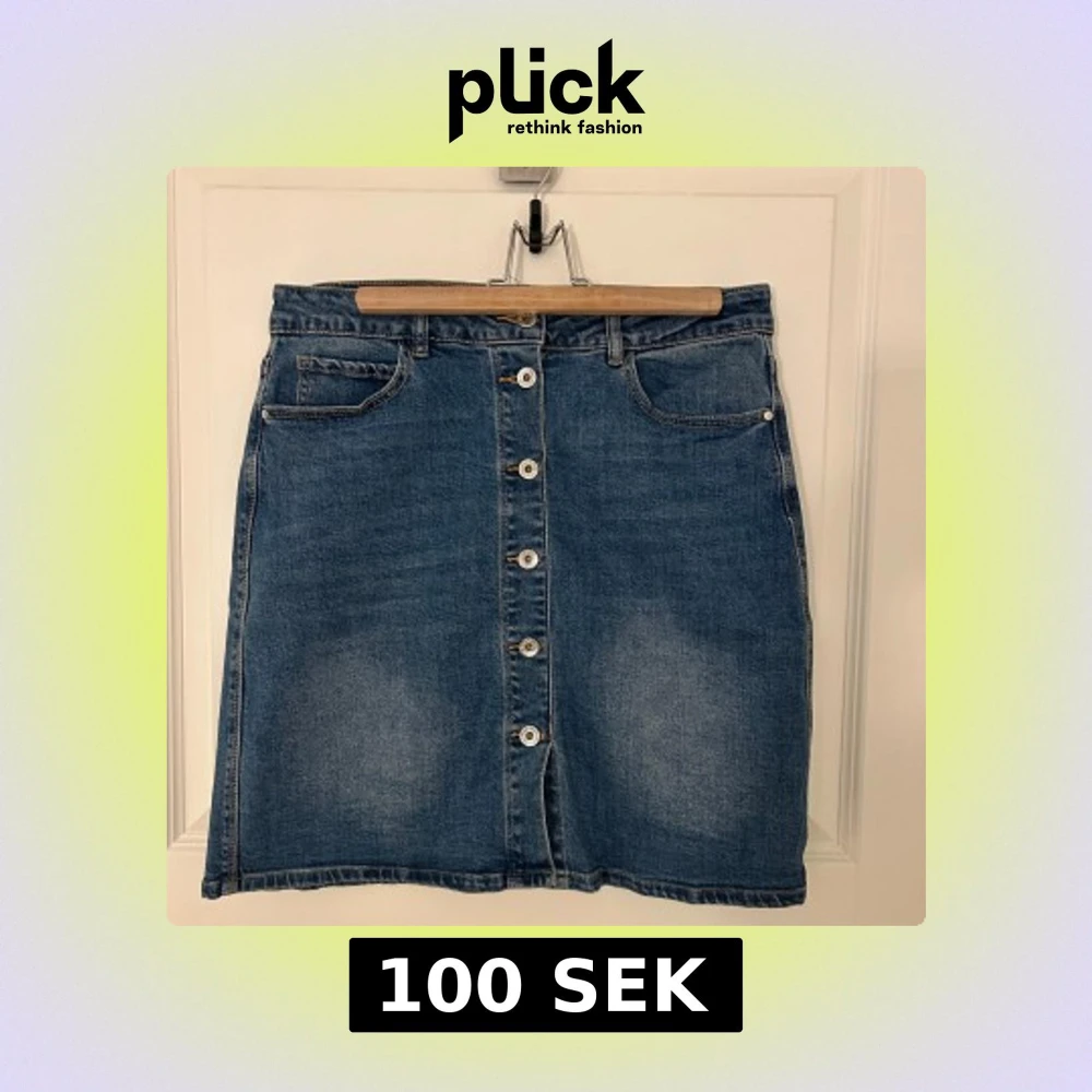 Snygg jeanskjol i klassisk blå denim med knappar framtill. Kjolen har en normal passform och praktiska fickor både fram och bak. Stretch i tyget! Aldrig använd.