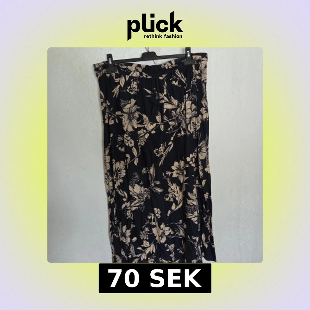 Säljer en mörkblå långkjol från Bonprix med beige blommönster. Kjolen har resår i midjan baktill och dekorativa knytband med tofsar. Ser svart ut på helbilderna, men är i den blå färgen som syns på detaljister.