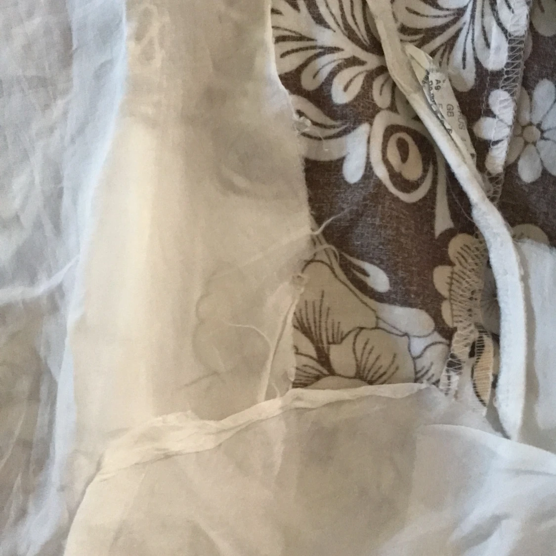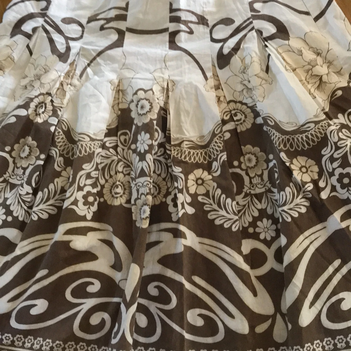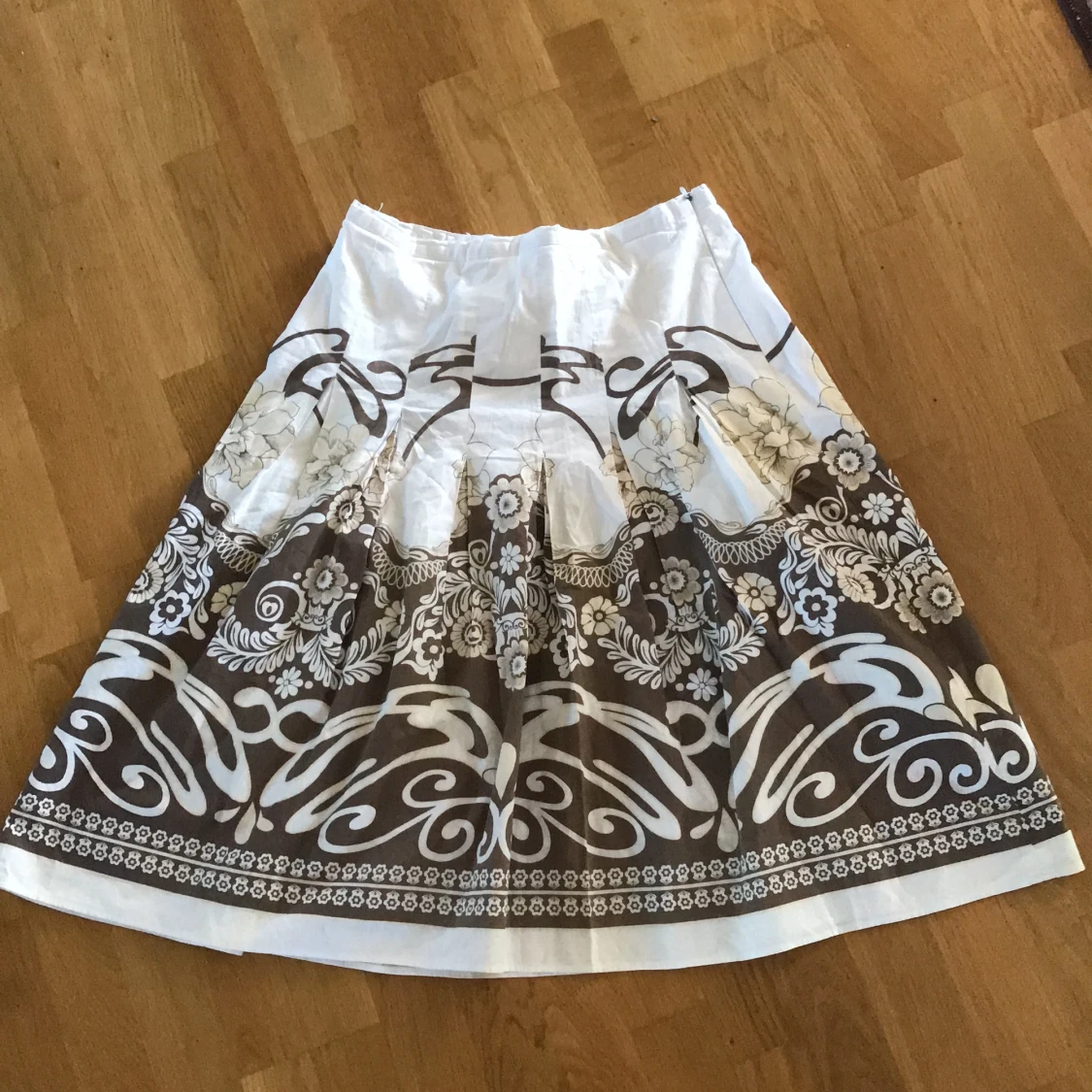 En lång kjol som jag inte vet storleken på men den är 38,5 cm rakt över vid midjan 🤍🤎 Innertyget är väldigt trasigt och slitet men det är inget som syns när man har på sig den☺️