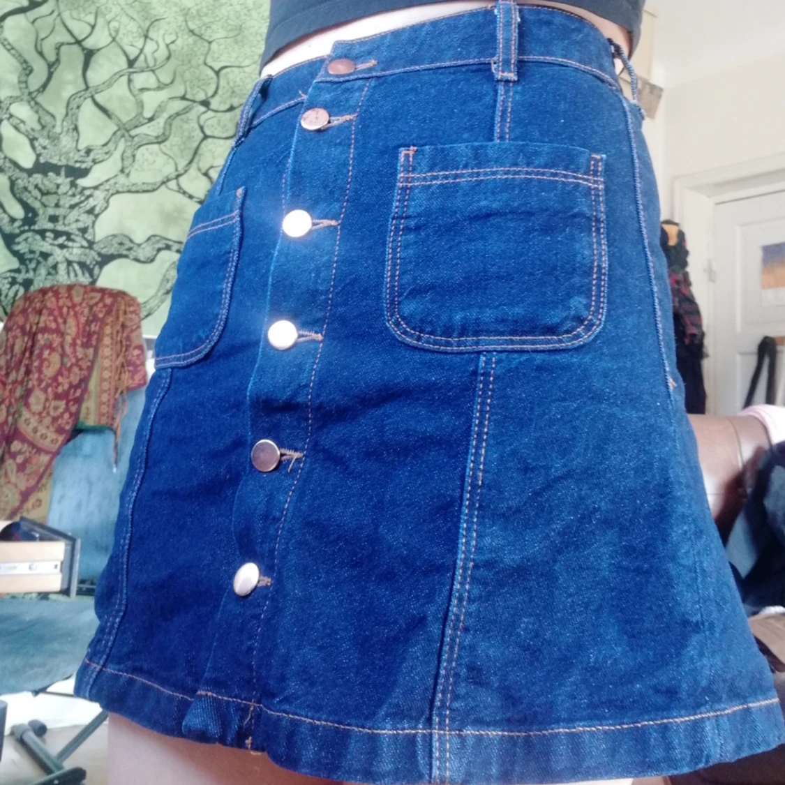 Superfin och älskad jeanskjol. Välanvänd men i gott skick förutom något nedsliten färg på knapparna. Säljer med sorg då jag vuxit ur den 💔 Går att hämta på södermalm Kan tänka mig frakta, köparen betalar för frakten