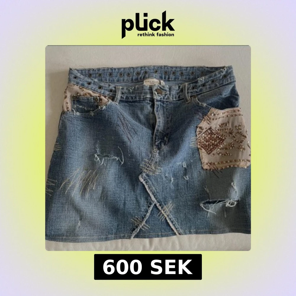 Unik kort jeanskjol från Karen Millen med coola slitningar, broderade detaljer och inslag av beige tyg med pärlor och paljetter. Kjolen har nitar i midjan och en omlottliknande front. Perfekt för dig som vill sticka ut med en edgy och kreativ stil.