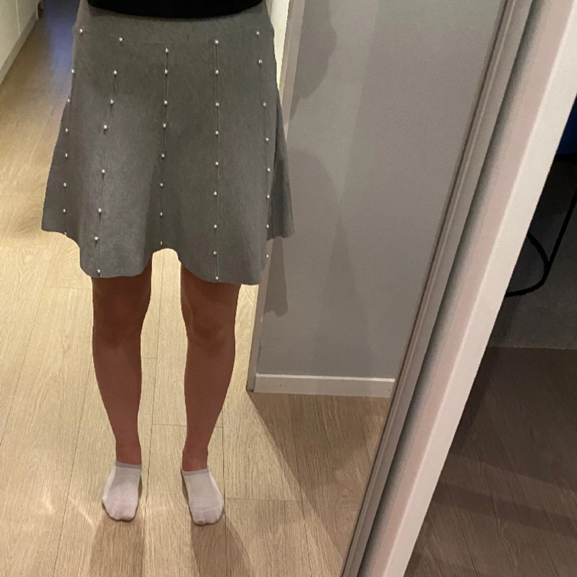 Grå kjol med pärlor på framsidan. Köpt i USA så storleken är ”10” skulle säga att det är som 156/164 i EU storlek. Den har blivit använd ett fåtal gånger men är i mycket bra skick.