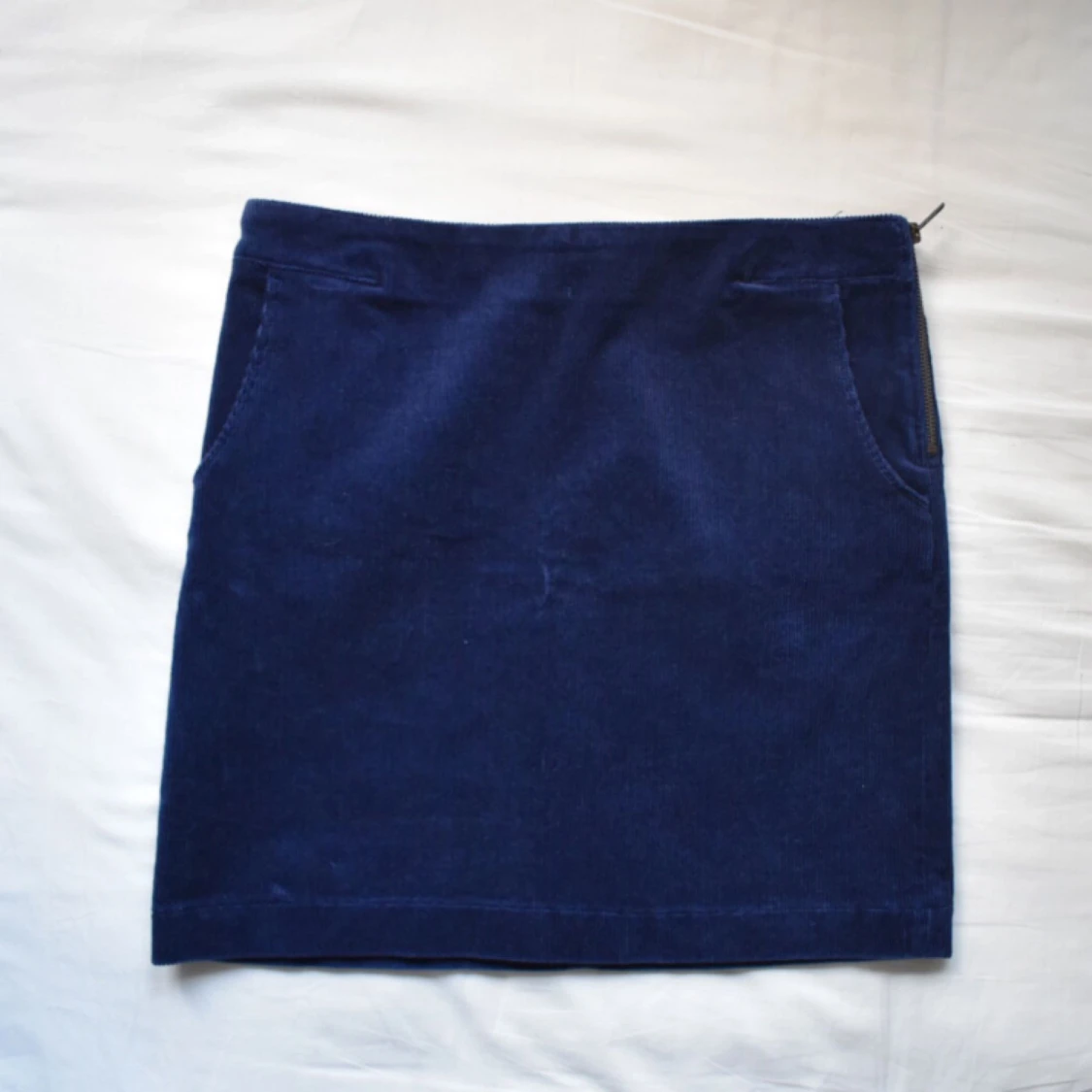 Blå manchesterkjol med dragkedja i sidan. Den första bilden ger färgen rättvisa