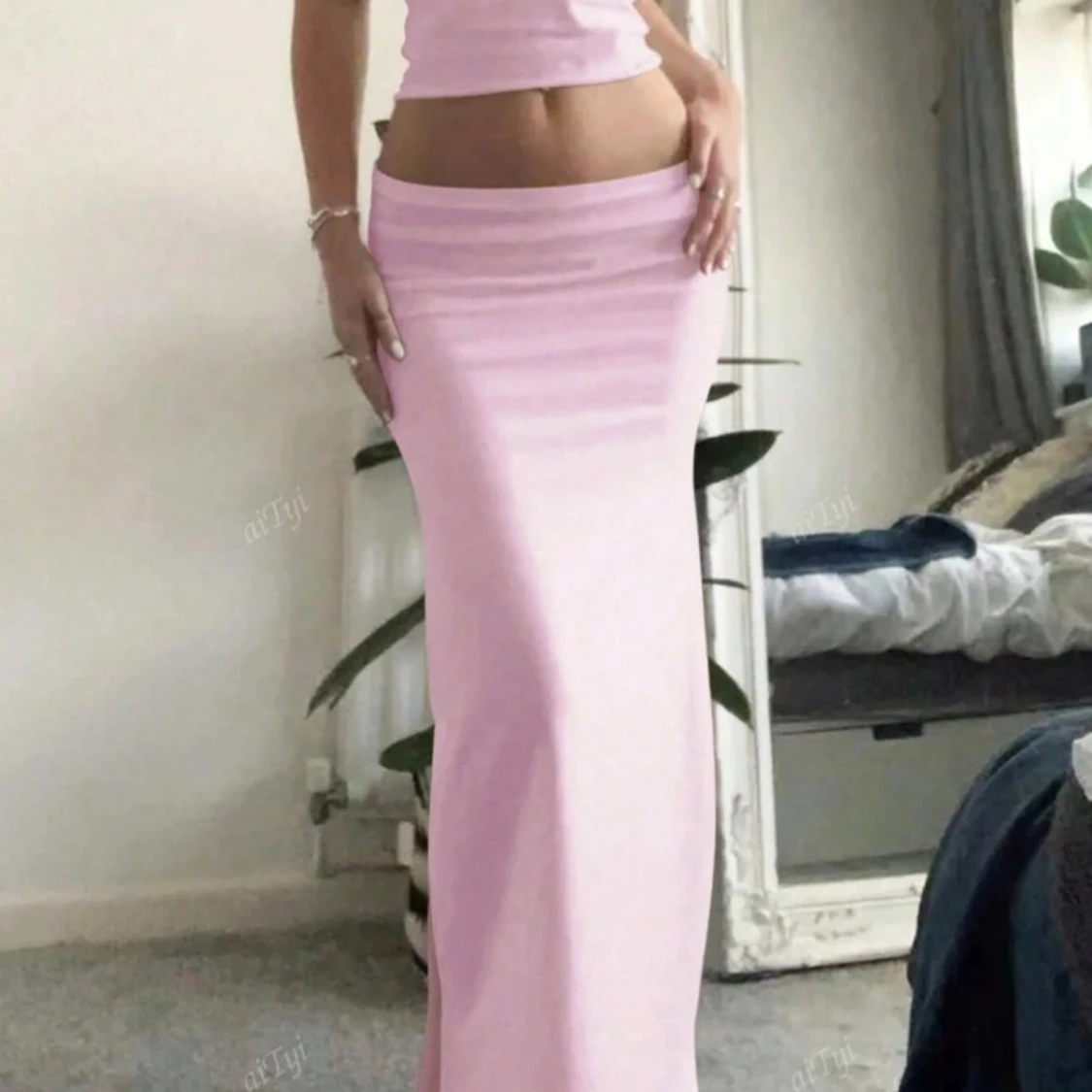 Supersnygg ljusrosa långkjol med tight passform och låg midja (hög om du vill). Kjolen är enkel och stilren utan mönster, gjord i ett stretchigt och mjukt material som sitter skönt mot kroppen. Du får också med en top som matchar , den är utan band och är samma material som kjolen så den bllir ett matchade set🩷🩷