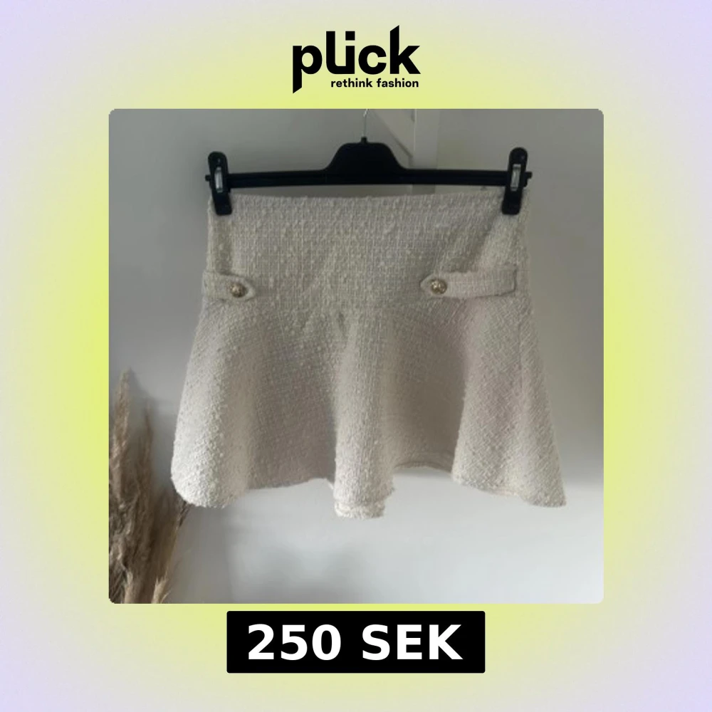 Superfin beige kortkjol från H&M i bouclé-look med dekorativa guldknappar framtill. Kjolen är tillverkad i 100% återvunnen polyester och har en lätt utsvängd form. Perfekt för dig som gillar en chic och trendig stil.