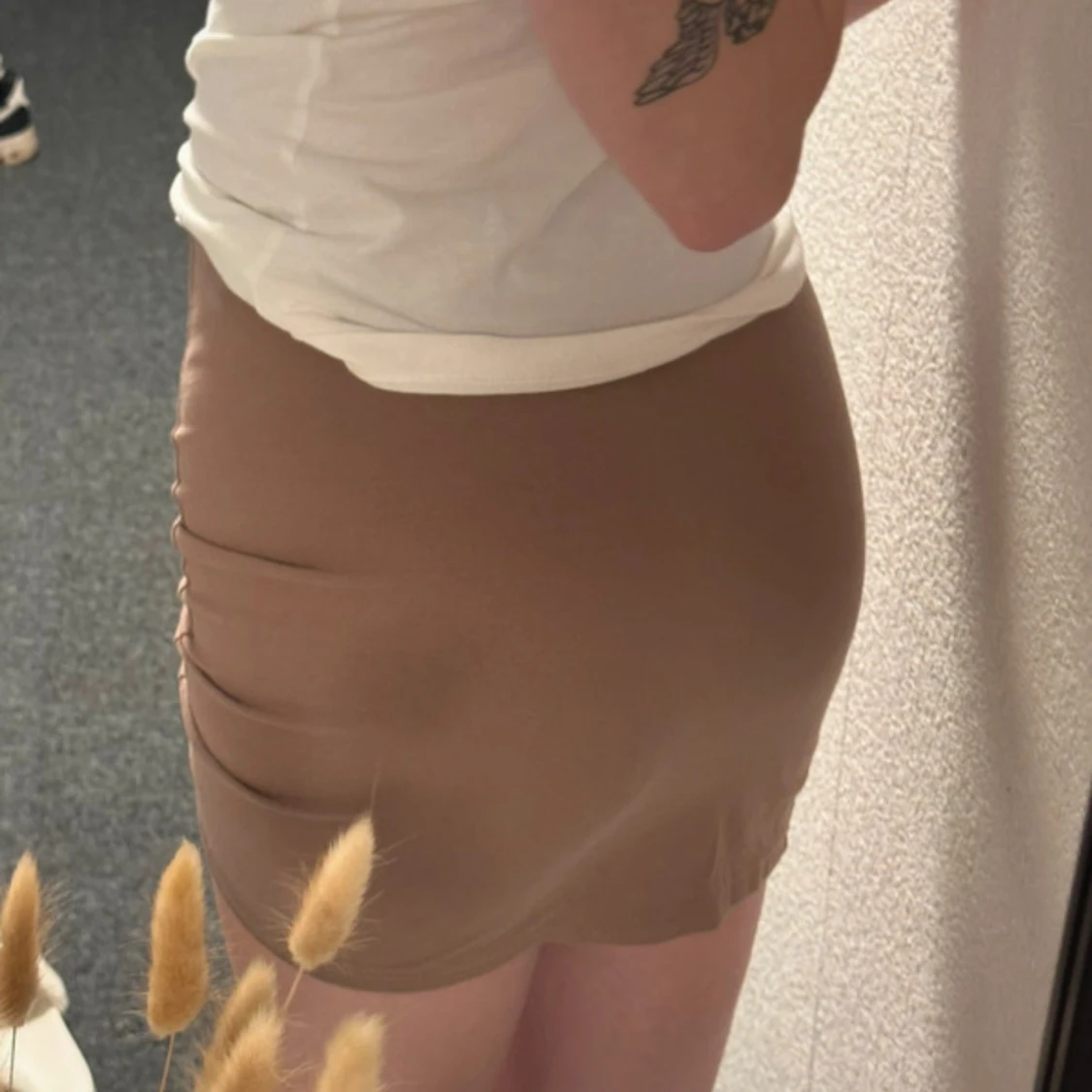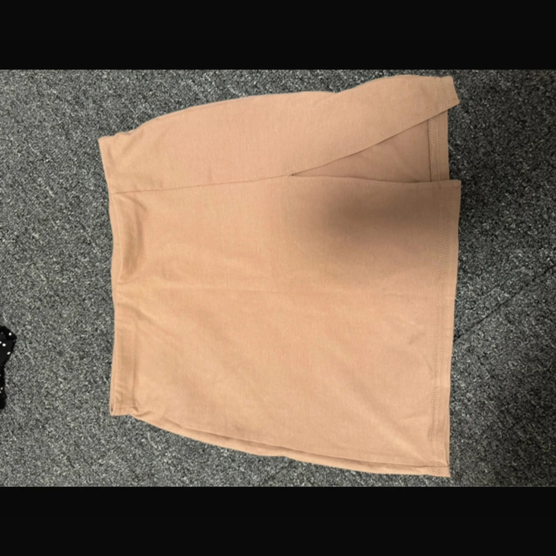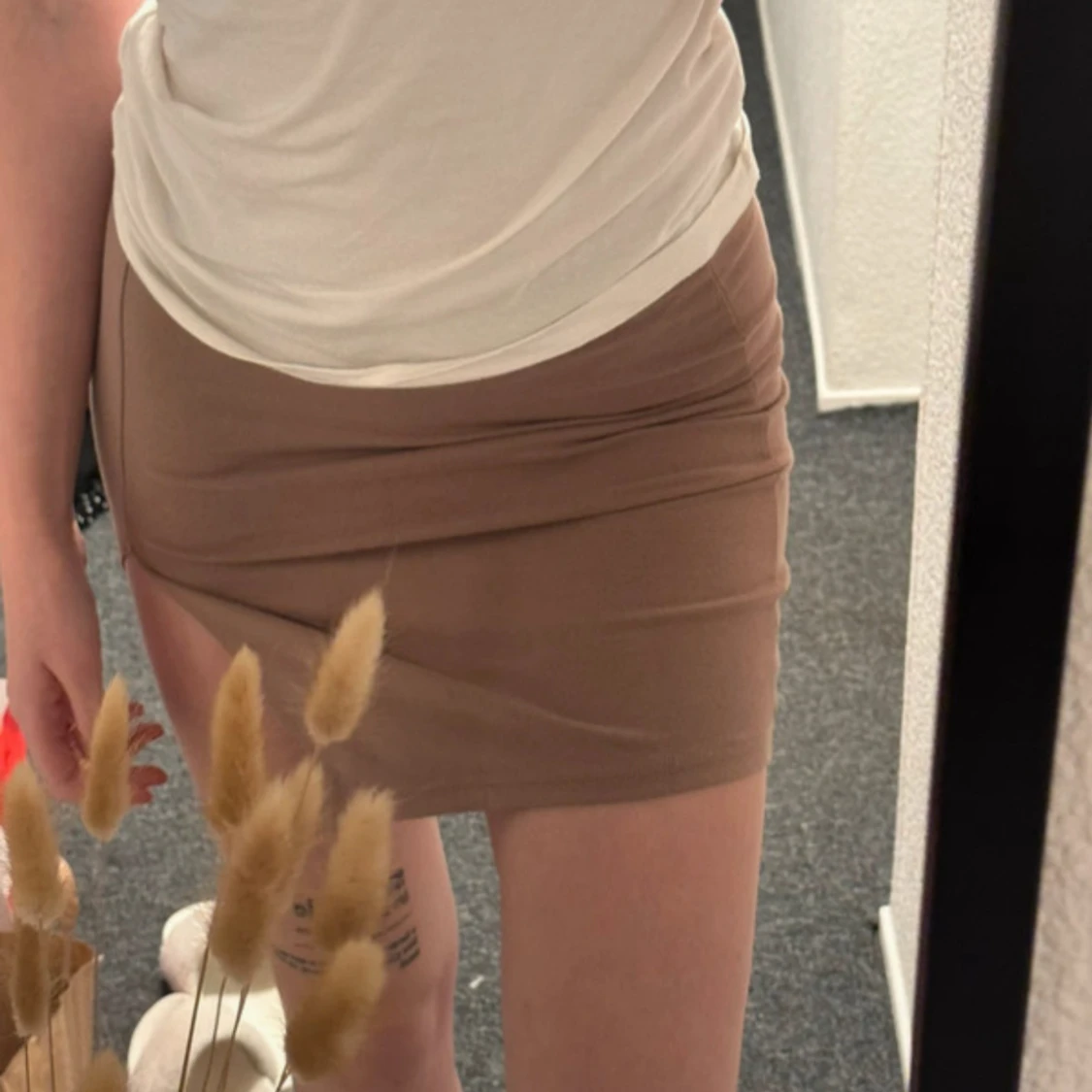 Säljer en beige kortkjol med omlott-detalj och lätt asymmetrisk nederkant. Kjolen har en tight passform och är tillverkad i ett mjukt, stretchigt material som sitter snyggt på kroppen. Perfekt för dig som gillar stilrena och enkla plagg.