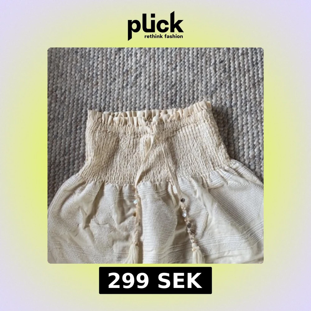 Supersöt beige kortkjol från Zara med smockad midja och knytband dekorerade med snäckor och pärlliknande detaljer. Kjolen har en strukturerad yta och volangkant upptill, perfekt för en chill sommarlook.