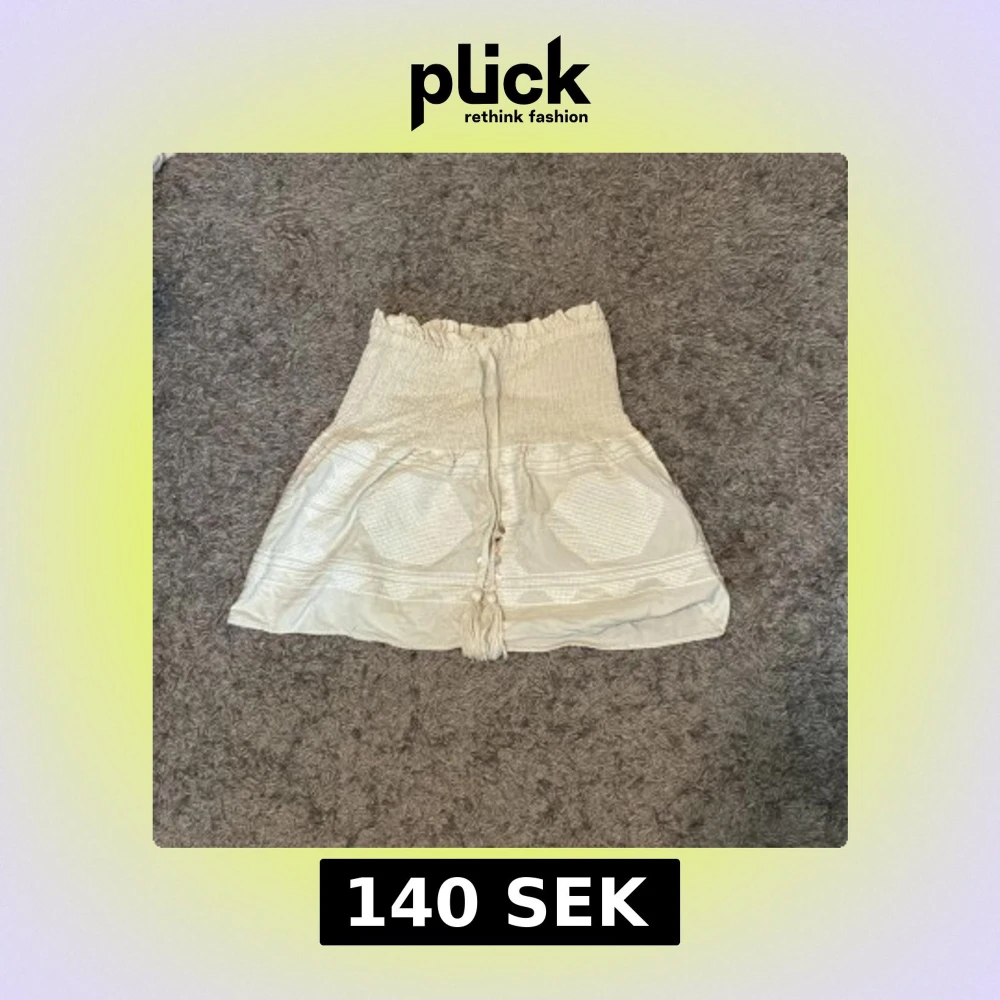 Superfin beige kortkjol från Zara i linneblandning. Kjolen har smock i midjan, snörning med tofsar och pärldetaljer samt broderade mönster. Perfekt för en chill sommardag eller festival. Säljs i storlek S.