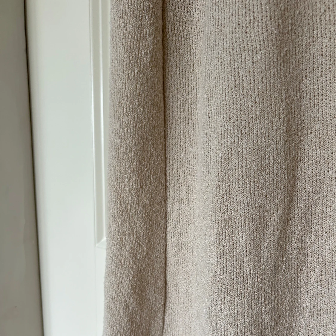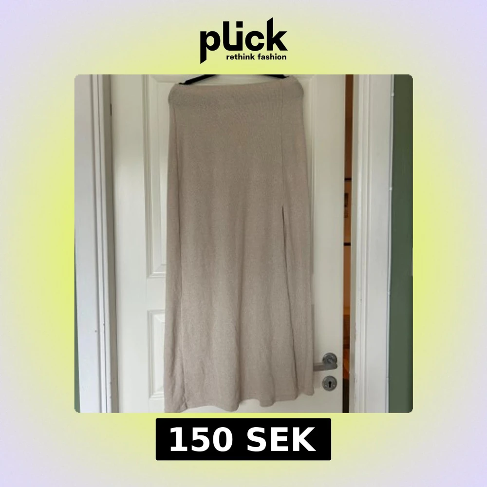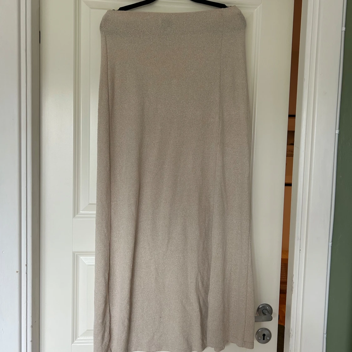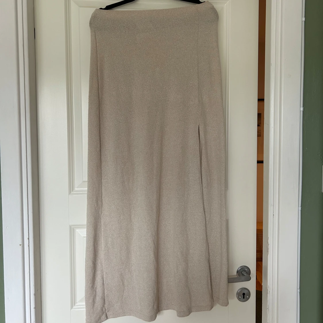 Supersnygg beige ”stickad” långkjol med diskret slits på sidan. Kjolen har en mjuk och följsam känsla. Rak i modellen. Når nästan ner till min ankel (162 cm). Mycket luftig!