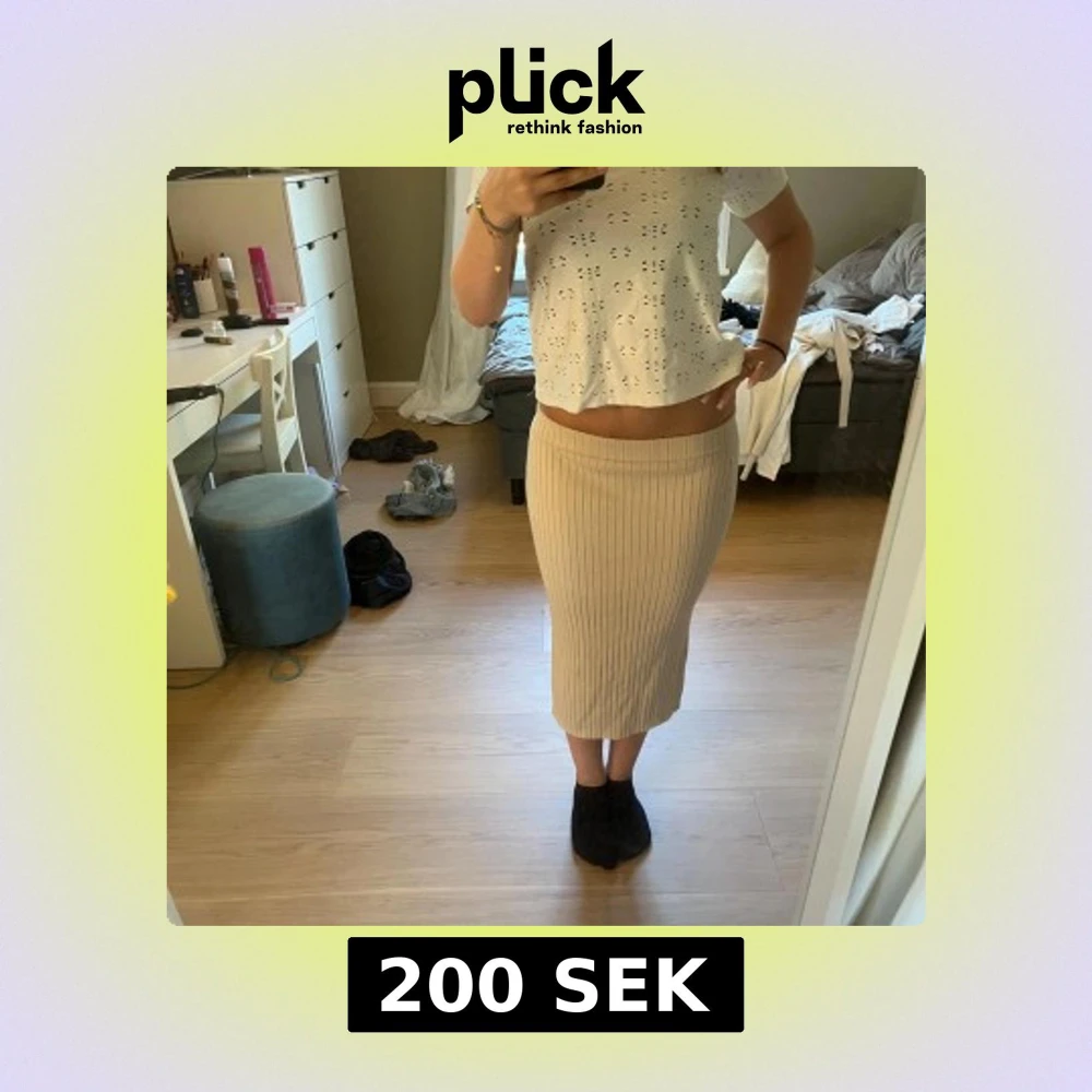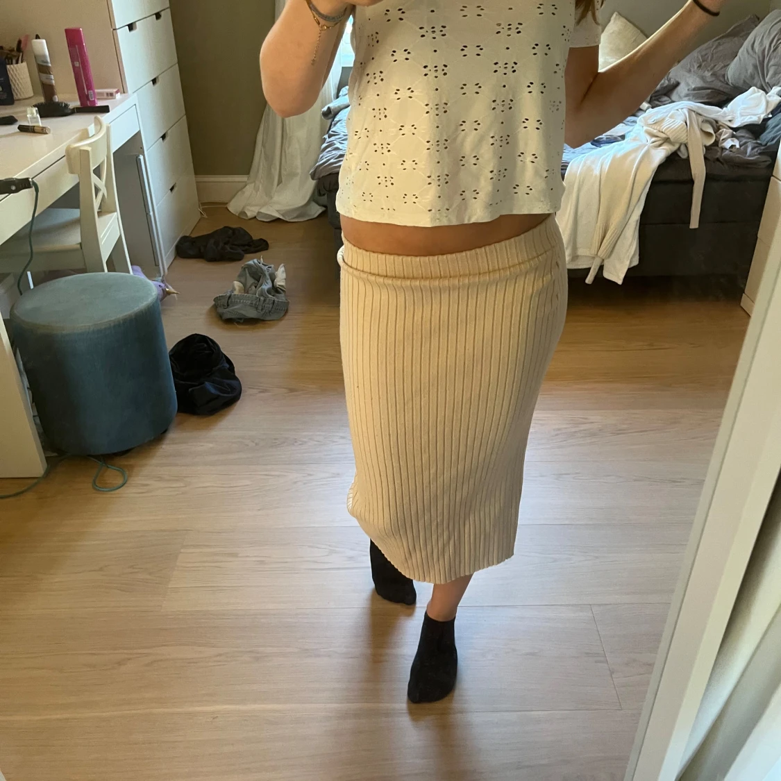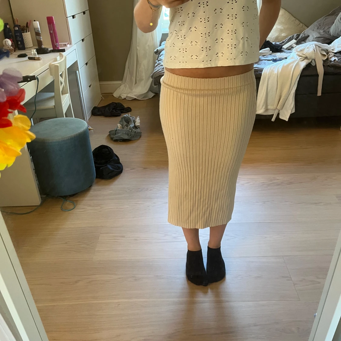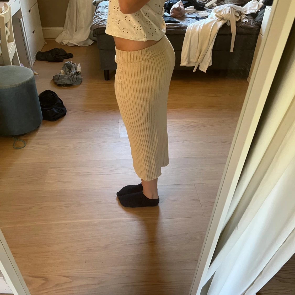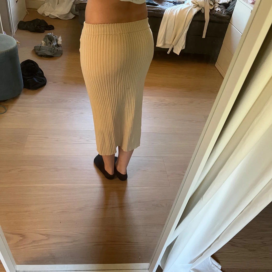 Säljer en beige ribbad stickad långkjol med låg midja och rak passform. Kjolen är mjuk och stretchig, perfekt för en chill och snygg look. Passar lika bra med sneakers som boots. Enkel att matcha med olika toppar.