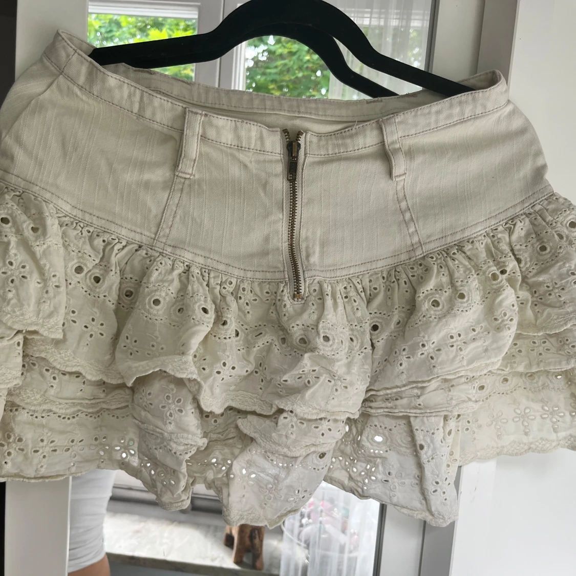 Säljer en superfin vit kjol från River Island. Den har en söt volangdetalj och en dragkedja bak. Perfekt för sommaren eller en festlig dag! Kjolen är i bra skick och har en romantisk stil med broderade detaljer.