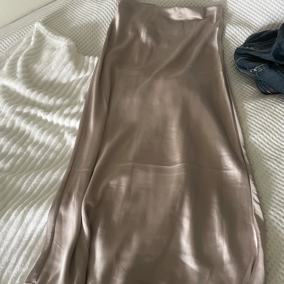 Säljer en beige skitsnygg långkjol i satinliknande material då den inte kommer till användning 😊😊💗 jättebra skick och inga defekter