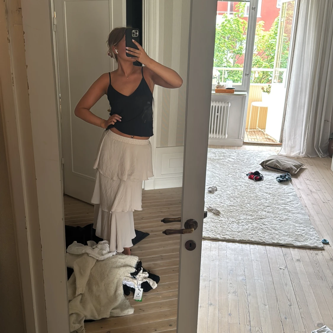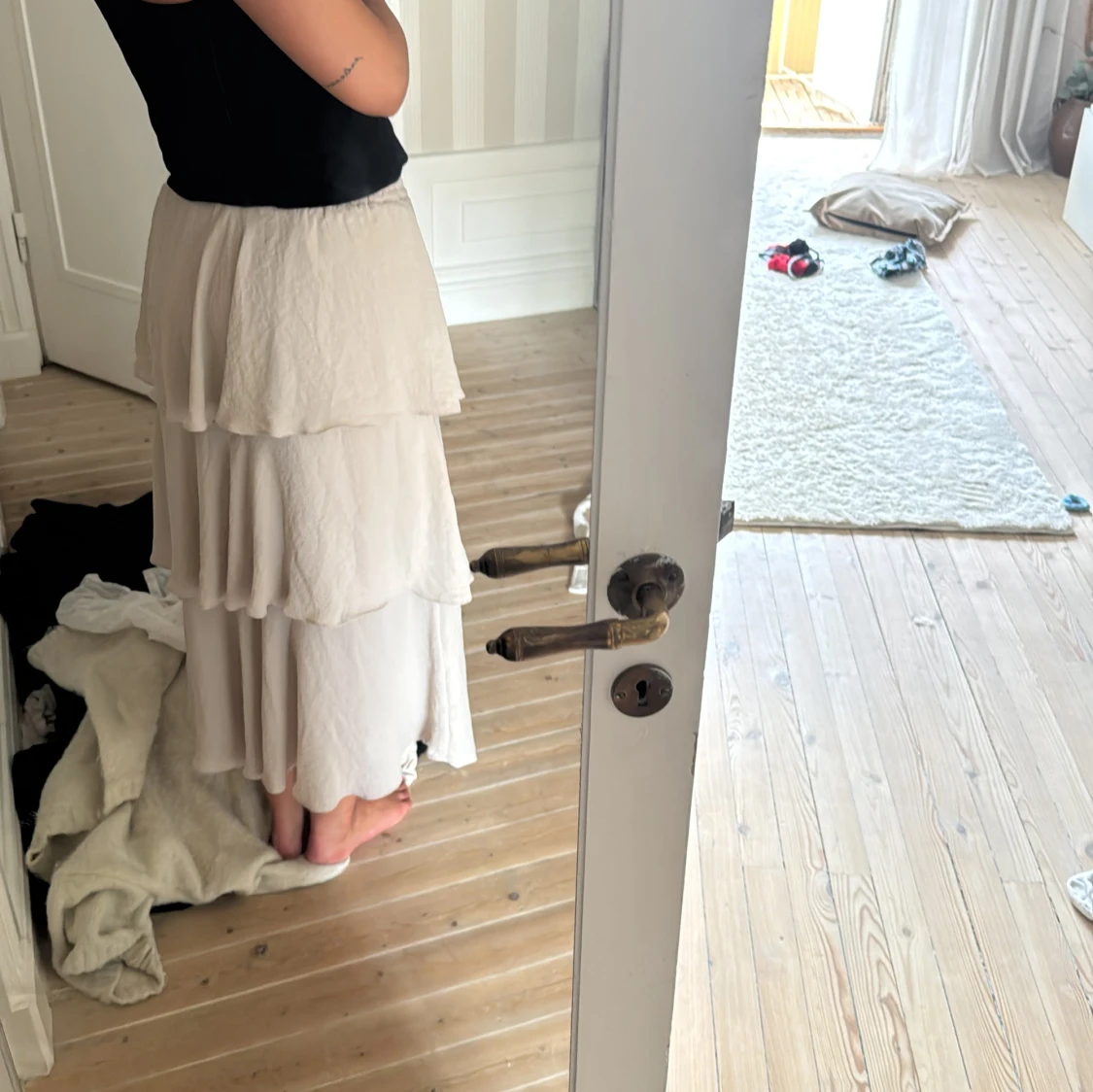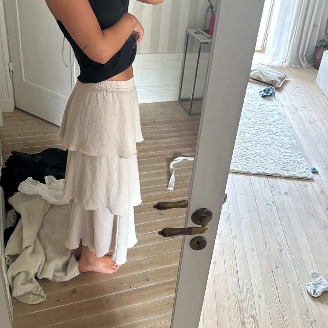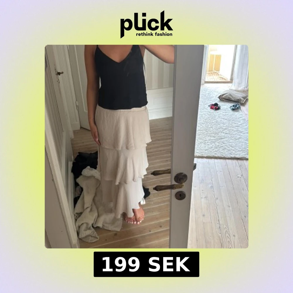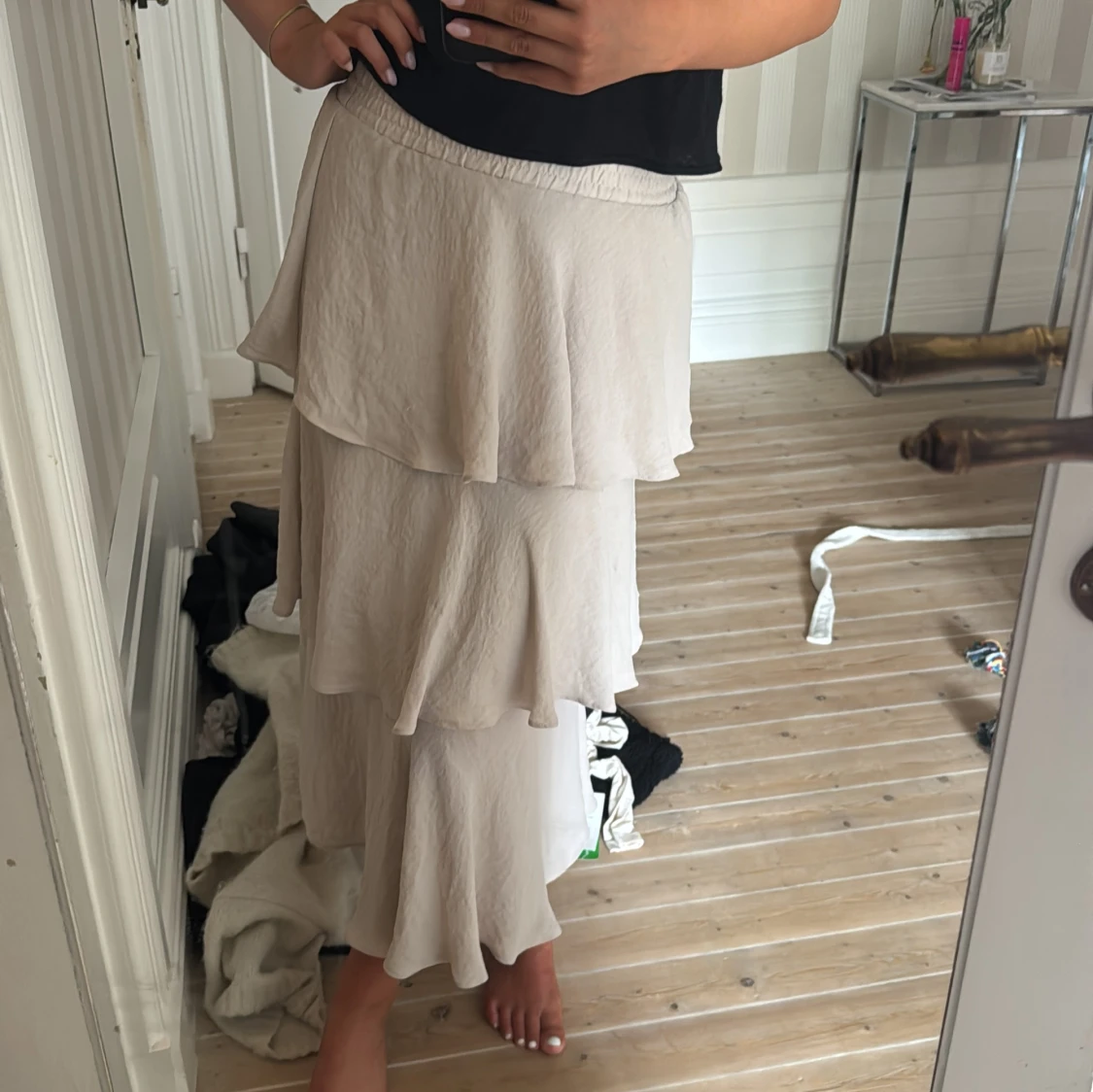 Säljer en lång beige kjol med flera lager volanger och skön resår i midjan. Kjolen har en flowy känsla och är perfekt för dig som gillar en romantisk och avslappnad stil. Passar snyggt till både linne och stickad tröja.