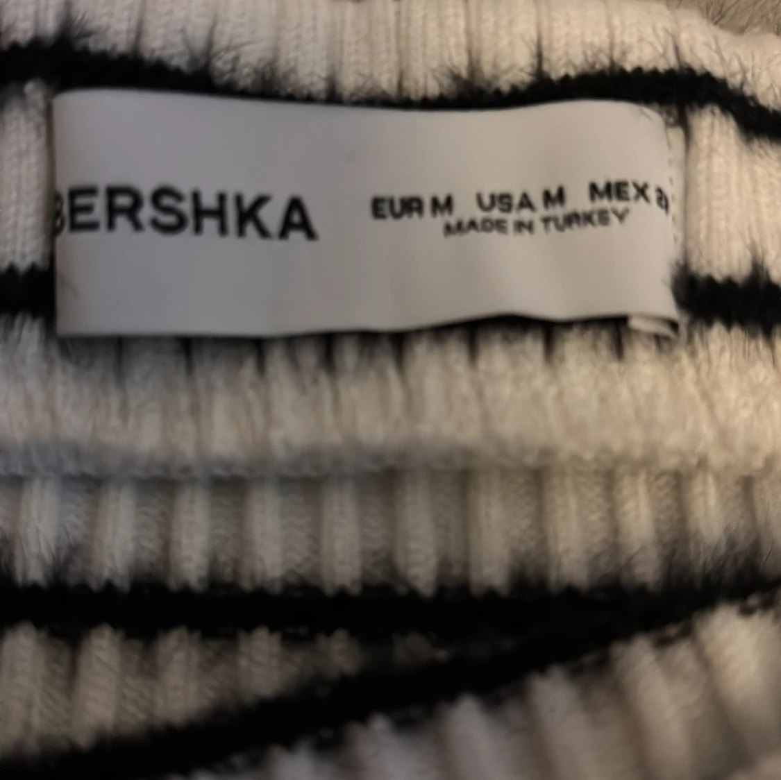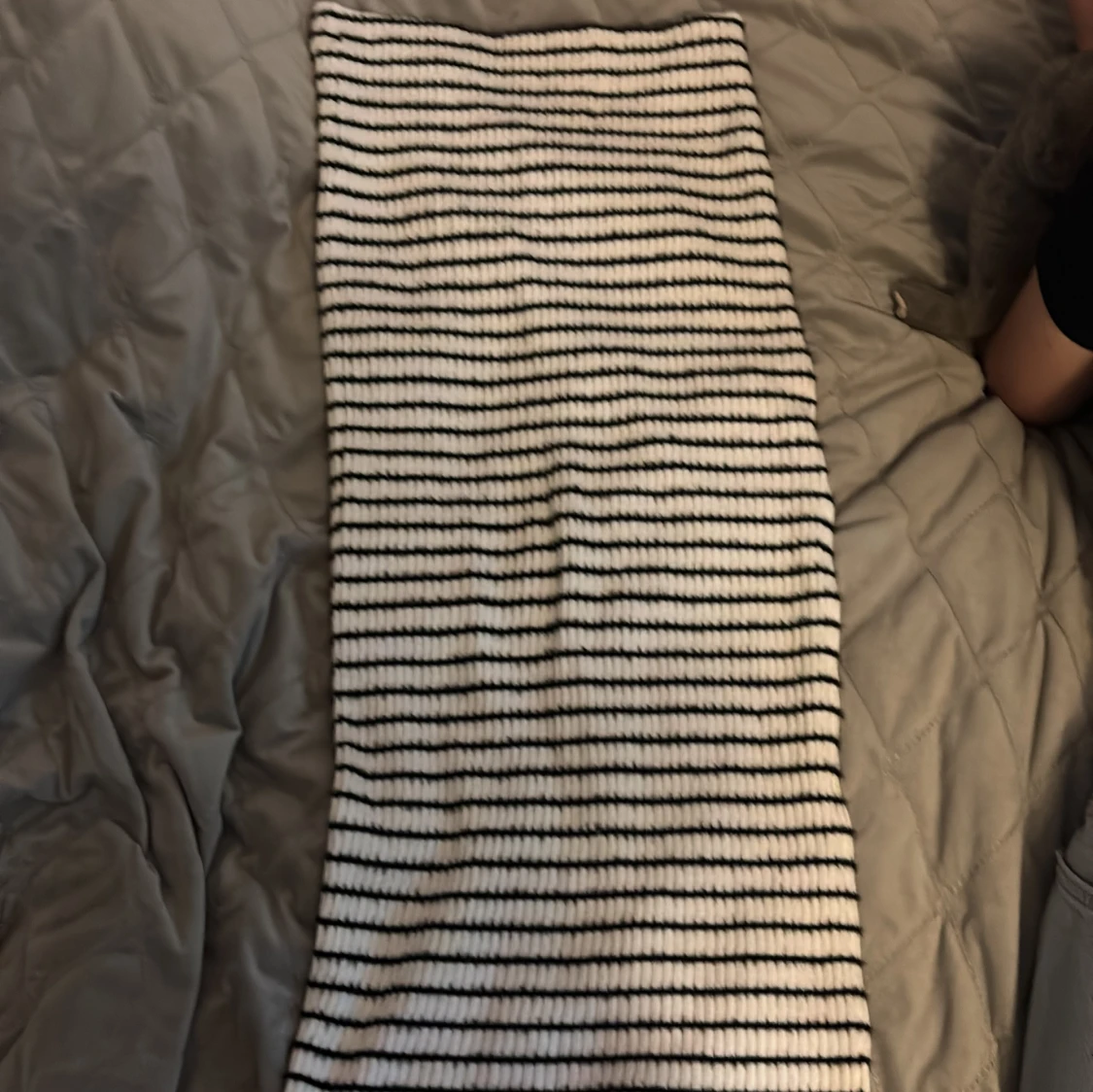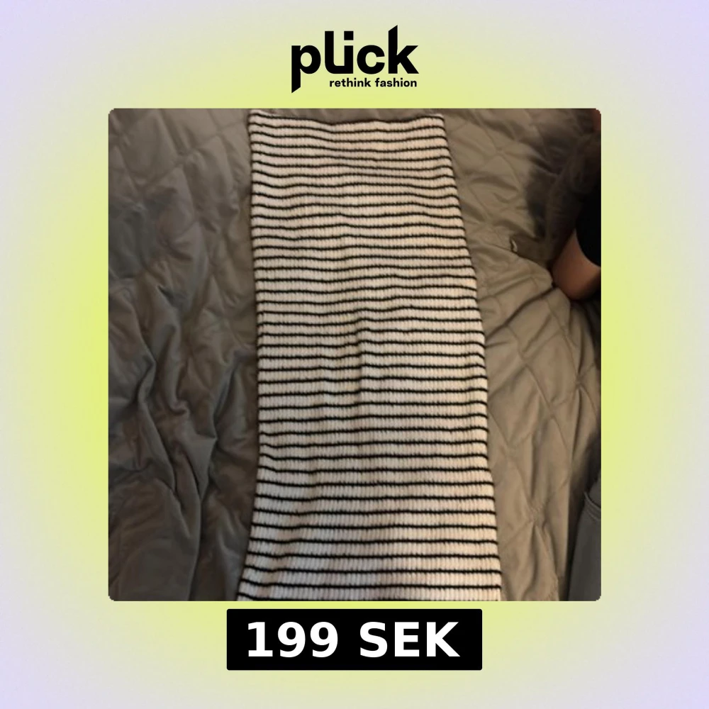 Säljer en ribbad kjol från Bershka i vitt med svarta ränder. Kjolen är rak i modellen och har en slitt längst med vänster ben
