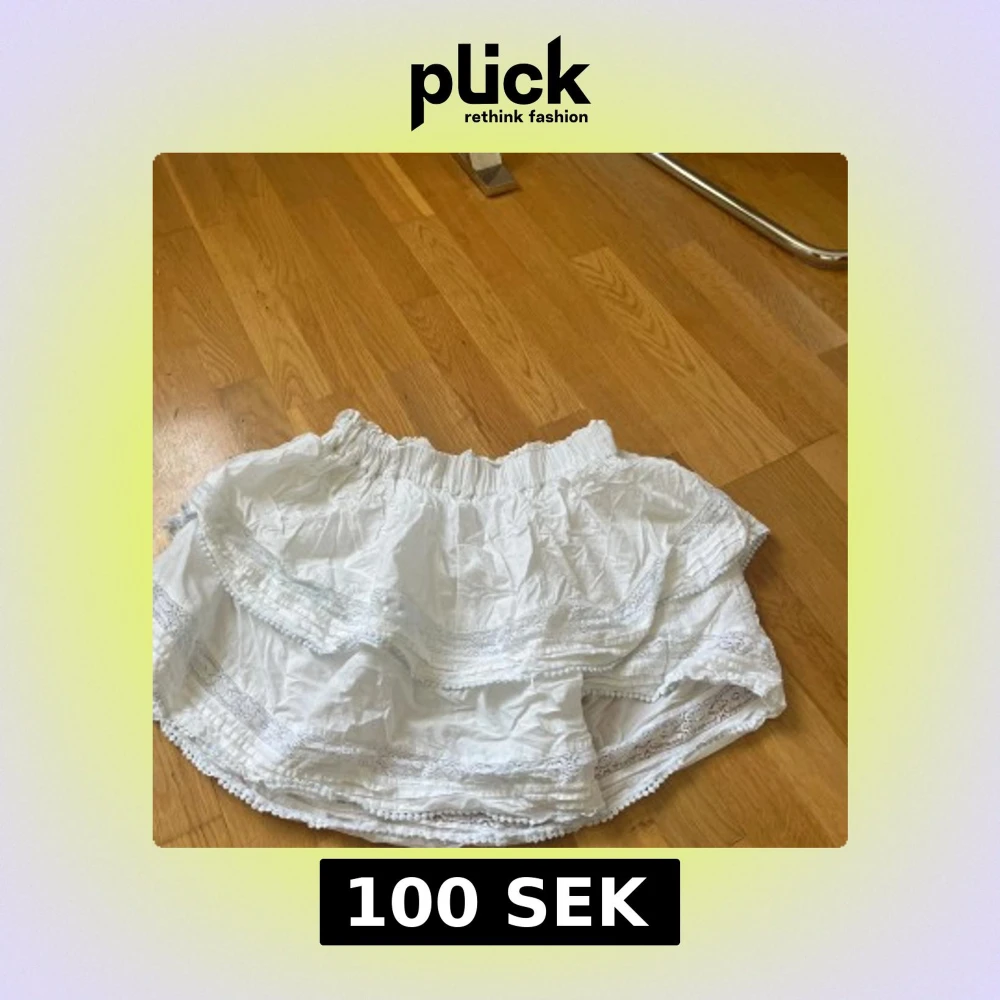 Supersöt vit kortkjol från BikBok i bomull med bred resår i midjan. Kjolen har flera lager volanger och fina spetsdetaljer längs kanterna. Perfekt för sommarens alla tillfällen och ger en romantisk vibe.